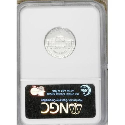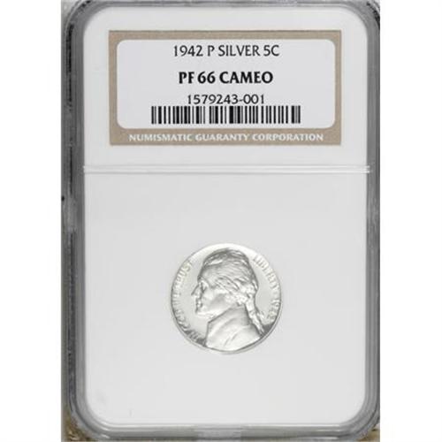 <B>1942-P 5C Type 2 PR66 Cameo NGC.</B></I> An unusual example of the always-popular proof war nickel. NGC has certified only a single Cameo proof in this grade, and only four finer (11/07). A sharply struck survivor with brilliant silver surfaces and deeply mirrored fields. Cameo proof coins of any denomination from 1936 through 1942 are rare, and the one year type nature of this issue will certainly inspire spirited bidding.<BR><BR><b>Shipping:</b> Coins & Currency (<a target="_blank" href="http://www.heritageauctions.com/common/shipping.php">view shipping information</a>)