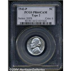 <B>1942-P<5C> Type 2 PR66 Cameo PCGS.</B></I> This is an extraordinary opportunity for the PCGS Set Registry collector to obtain a Cameo proof war nickel. PCGS has only certified three Cameo proofs, one graded 64, and two certified as Proof-66. This is very sharply struck (as, indeed, it should be) with brilliant silver surfaces and rather deeply mirrored fields. Cameo proof coins of any denomination from the 1930s and 1940s (1936 through 1942) are extremely rare. <BR><BR><B>Important notice:</B> Heritage usually auctions material at the rate of 200-250 lots per hour. On some occasions eBay Live bid software or the Internet may not be able to keep up with the pace of the auction. We recommend placing a realistic absentee bid now as insurance to avoid disappointment. Occasionally the auctioneer may eliminate or reject an eBay Live bid, and the auctioneer may also reopen a lot after the close of the eBay live bidding (usually because we missed an audience bid), and may reject your bid even if it shows you as the winning bidder. By bidding via eBay Live, you agree that Heritage may award the lot to another bidder at its sole discretion under the circumstances described above or any other reasonable circumstances. Since eBay bids are not shown to us until we open the lot on the floor, we treat those bids just like floor bids. In most cases the floor responds before the eBay bid is presented to us, due to Internet lag time, so for consistency we have made it a policy that floor bids are always considered first over tie eBay live bids. Also please note that all Heritage lots purchased through eBay Live carry a 20% Buyer's Premium. Please make sure you read the Terms and Conditions before you bid. </span></font></tr></table></td></tr></table>