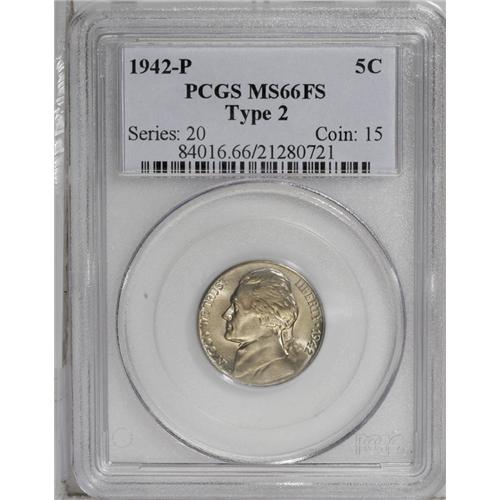 <B>1942-P<5C> Type Two MS66 Full Steps PCGS.</B></I> This lustrous light gold Premium Gem is nicely struck and splendidly undisturbed. A vertical die crack bisects the reverse, and the base of the mintmark is lightly repunched.