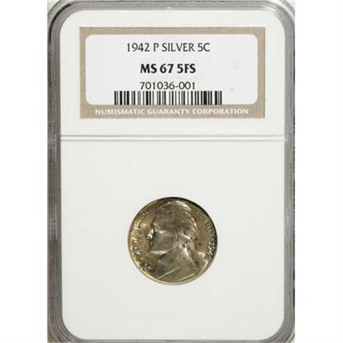 <B>1942-P 5C Silver Type Two MS67 5FS NGC.</B></I> NGC Census: (1810/2). PCGS Population (91/0). Mintage: 57,900,600. Numismedia Wsl. Price for NGC/PCGS coin in MS67: $48. (#4016)<BR><BR><B>Coin Engraver:</B> Felix Schlag<BR><BR><b>Shipping:</b> Coins & Currency (<a target="_blank" href="http://www.heritageauctions.com/common/shipping.php">view shipping information</a>)