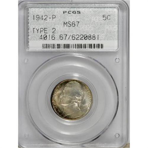 <B>1942-P 5C Type Two MS67 PCGS.</B></I> . PCGS Population (91/0). NGC Census: (1812/2). Mintage: 57,900,600. Numismedia Wsl. Price for NGC/PCGS coin in MS67: $49. (#4016)<BR><BR><B>Coin Engraver:</B> Felix Schlag<BR><BR><b>Shipping:</b> Coins & Currency (<a target="_blank" href="http://www.heritageauctions.com/common/shipping.php">view shipping information</a>)