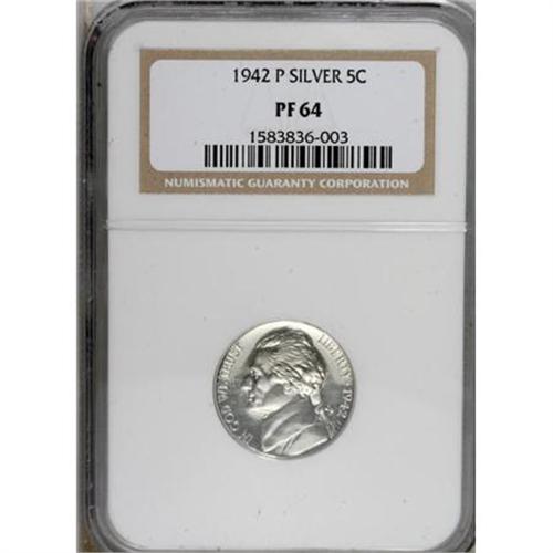 <B>1942-P 5C Silver Type Two PR64 NGC.</B></I> NGC Census: (295/1829). PCGS Population (872/3235). Mintage: 27,600. Numismedia Wsl. Price for NGC/PCGS coin in PR64: $120. (#4180)<BR><BR><B>Coin Engraver:</B> Felix Schlag<BR><BR><b>Shipping:</b> Coins & Currency (<a target="_blank" href="http://www.heritageauctions.com/common/shipping.php">view shipping information</a>)