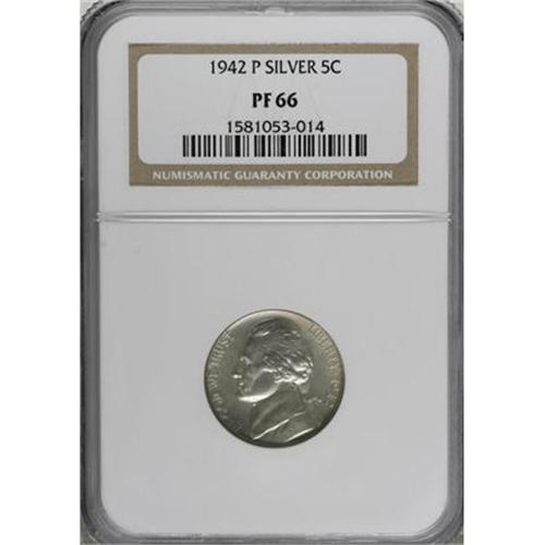 <B>1942-P 5C Type Two PR66 NGC.</B></I> NGC Census: (886/320). PCGS Population (1261/317). Mintage: 27,600. Numismedia Wsl. Price for NGC/PCGS coin in PR66: $170. (#4180)<BR><BR><B>Coin Engraver:</B> Felix Schlag<BR><BR><b>Shipping:</b> Coins & Currency (<a target="_blank" href="http://www.heritageauctions.com/common/shipping.php">view shipping information</a>)