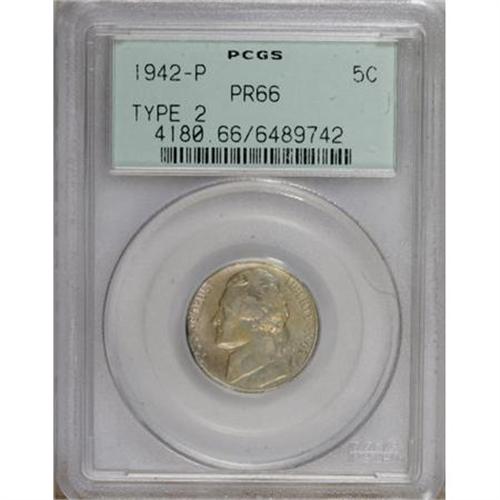 <B>1942-P 5C Type Two PR66 PCGS.</B></I> PCGS Population (1248/311). NGC Census: (878/317). Mintage: 27,600. Numismedia Wsl. Price for NGC/PCGS coin in PR66: $170. (#4180)<BR><BR><B>Coin Engraver:</B> Felix Schlag<BR><BR><b>Shipping:</b> Coins & Currency (<a target="_blank" href="http://www.heritageauctions.com/common/shipping.php">view shipping information</a>\)