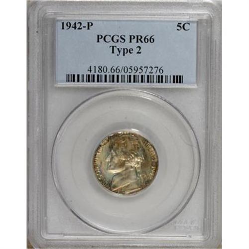 <B>1942-P 5C Type Two PR66 PCGS.</B></I> PCGS Population (1248/311). NGC Census: (878/317). Mintage: 27,600. Numismedia Wsl. Price for NGC/PCGS coin in PR66: $170. (#4180)<BR><BR><B>Coin Engraver:</B> Felix Schlag<BR><BR><b>Shipping:</b> Coins & Currency (<a target="_blank" href="http://www.heritageauctions.com/common/shipping.php">view shipping information</a>\)