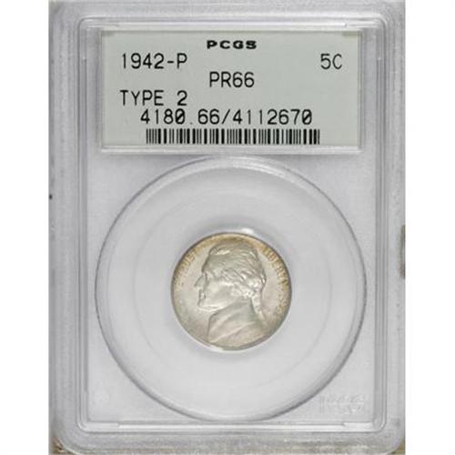 <B>1942-P 5C Type Two PR66 PCGS.</B></I> PCGS Population (1268/318). NGC Census: (892/319). Mintage: 27,600. Numismedia Wsl. Price for NGC/PCGS coin in PR66: $170. (#4180)<BR><BR><B>Coin Engraver:</B> Felix Schlag<BR><BR><b>Shipping:</b> Coins & Currency (<a target="_blank" href="http://www.heritageauctions.com/common/shipping.php">view shipping information</a>)