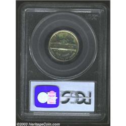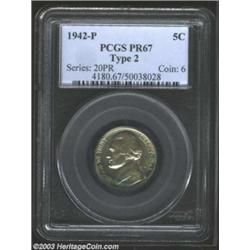 1942-P 5C Type Two PR67 PCGS. Blushes of powder-blue, orange-gold, and lilac iridescence drift toward the lower obverse and upper reverse borders. Otherwise silver-gray in sheen with full underlying brilliance from an obviously proof impression. The only specimen striking in the 1942-1945 War Nickel series. Important notice: We expect to be auctioning lots at the rate of 200-250 per hour. On occasion eBay live bid software cannot keep up with the pace of the auctions where 4-5 lots per minute can hammer down, so we recommend that you place a realistic absentee bid now as insurance to avoid disappointment. Also please note that all Heritage/CAA lots purchased through eBay Live carry a 20% Buyer's Premium. Please make sure you read the Terms and Conditions.