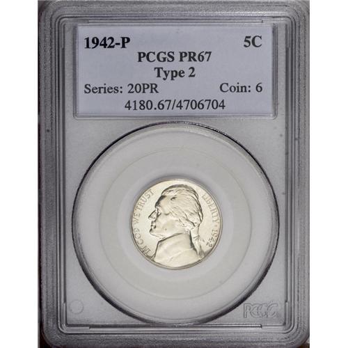 1942-P 5C Type Two PR67 PCGS. This War nickel displays 1942-P[5C] Type Two PR67 PCGS.