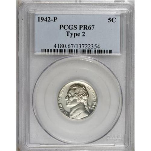 <B>1942-P 5C Type Two PR67 PCGS.</B></I> An untoned and gorgeous Superb Gem. The devices are lightly frosted, and the contrast is just shy of a Cameo designation. Flawless aside from an inconspicuous retained lamination near the E in WE.<BR><BR><B>Coin Engraver:</B> Felix Schlag<BR><BR><b>Shipping:</b> Coins & Currency (<a target="_blank" href="http://www.heritageauctions.com/common/shipping.php">view shipping information</a>)