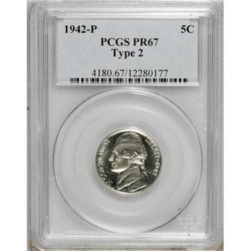 <B>1942-P 5C Type Two PR67 PCGS.</B></I> . PCGS Population (308/11). NGC Census: (304/18). Mintage: 27,600. Numismedia Wsl. Price for NGC/PCGS coin in PR67: $300. (#4180)<BR><BR><B>Coin Engraver:</B> Felix Schlag<BR><BR><b>Shipping:</b> Coins & Currency (<a target="_blank" href="http://www.heritageauctions.com/common/shipping.php">view shipping information</a>)