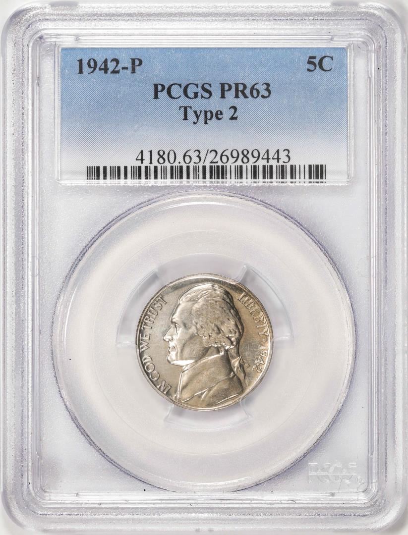 One 1942-P Type 2 Proof Jefferson Nickel Coin PCGS PR63. PCGS Graded.