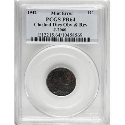 <B>1942 One Cent, Judd-2060, Low R.7--Clashed Dies Obverse & Reverse--PR64 PCGS.</B></I> Struck in brown plastic with a plain edge. The obverse motif shows a female bust right, derived from the Colombian two-centavo piece. The reverse displays UNITED/STATES/MINT within a wreath. Both fields display prominent clash marks, unusual for the experimental alloy 1942 cents. A satiny and unabraded near-Gem that has bold design details.<BR><BR><b>Shipping:</b> Coins & Currency (<a target="_blank" href="http://www.heritageauctions.com/common/shipping.php">view shipping information</a>\)