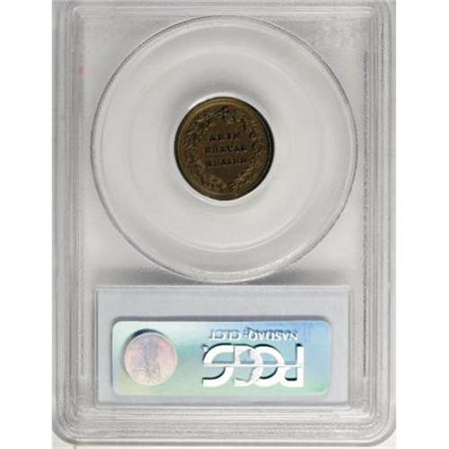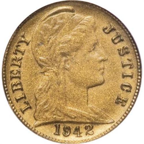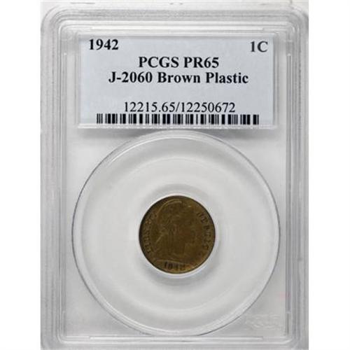 <B>1942 P1C Brown Plastic One Cent, Judd-2060, Pollock-4035, Low R.7, PR65 PCGS.</B></I> A privately made pattern struck from special Mint dies. The obverse shows a head of Liberty facing right, LIBERTY left and JUSTICE right, with the date below. The center of the reverse reads UNITED STATES MINT and is surrounded by a wreath. This particular piece is struck from brown plastic and has a plain edge. The brown surfaces have an underlying sparkle, undoubtedly from the plastic composition. A lovely piece with no problems. Judging from the appearance through the encasement, perhaps this composition should have gone into regular production.<BR><BR><b>Shipping:</b> Coins & Currency (<a target="_blank" href="http://www.heritageauctions.com/common/shipping.php">view shipping information</a>)
