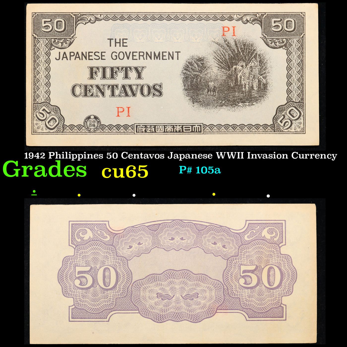 1942 Philippines 50 Centavos Japanese WWII Invasion Currency Grades Gem CU. Japanese invasion money, officially known as Southern Development Bank Notes (Japanese: ??????? Dai T?-A Sens? gunpy?, "Greater East Asia War military scrip"), was currency issued by the Japanese Military Authority as a replacement for local currency after the conquest of colonies and other states in World War II. Japan printed this currency for many countries, including Malaysia, Singapore, North Borneo, Sarawak, Burma, Brunei, and several Oceania territories controlled by Australia.