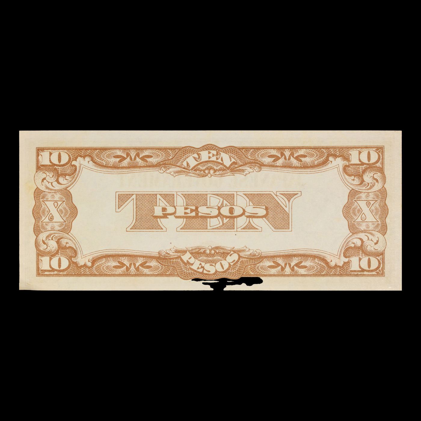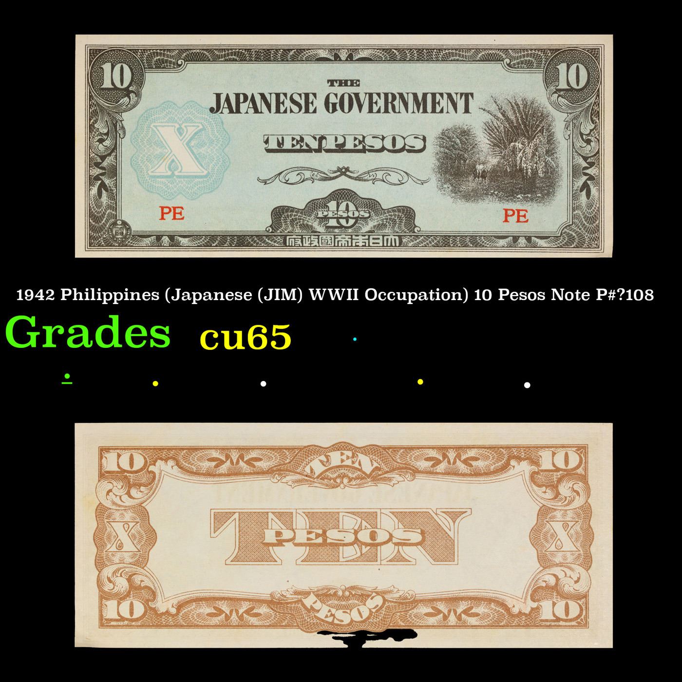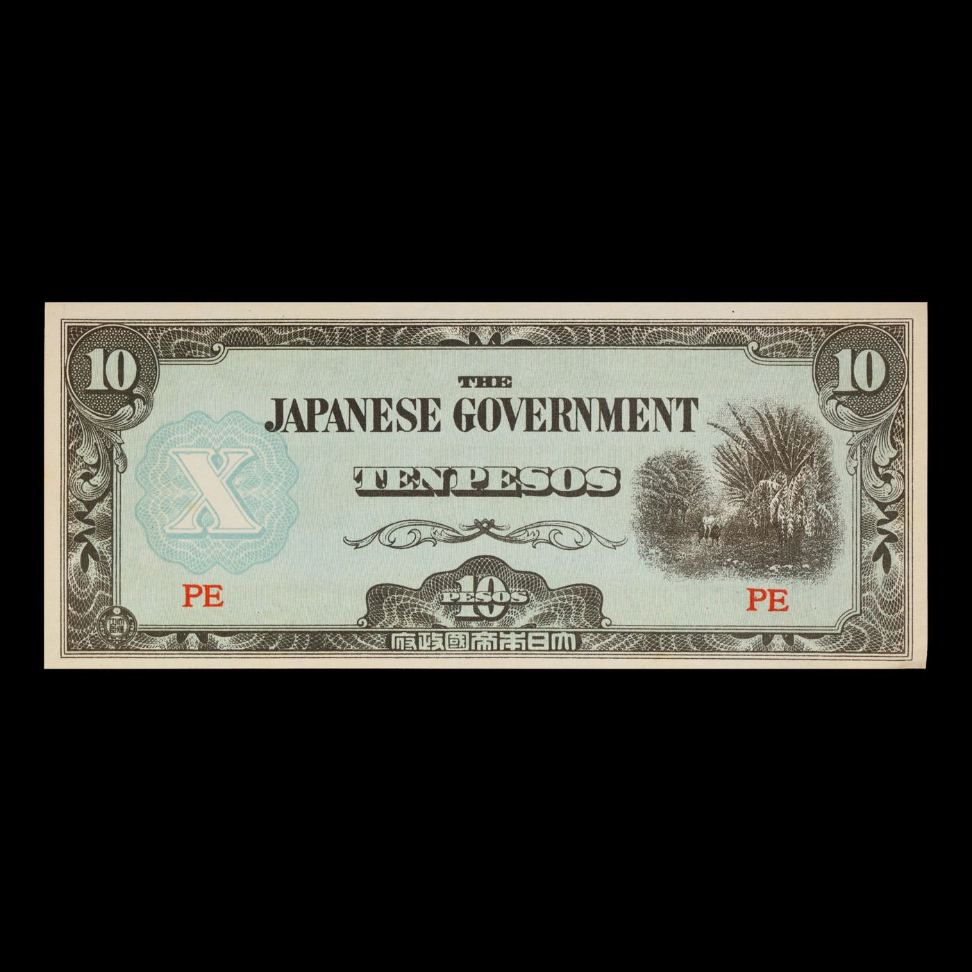 1942 Philippines (Japanese (JIM) WWII Occupation) 10 Pesos Note P#?108 Grades Gem CU. Japanese invasion money, officially known as Southern Development Bank Notes (Japanese: ??????? Dai T?-A Sens? gunpy?, "Greater East Asia War military scrip"), was currency issued by the Japanese Military Authority as a replacement for local currency after the conquest of colonies and other states in World War II. Japan printed this currency for many countries, including Malaysia, Singapore, North Borneo, Sarawak, Burma, Brunei, and several Oceania territories controlled by Australia. Some Japanese invasion notes are actually counterfeits produced by the American Office of Strategic Services or the British Special Operations Executive, meant to flood and destabilize the economy in the occupied areas, sometimes also including propaganda printed on the notes themselves.