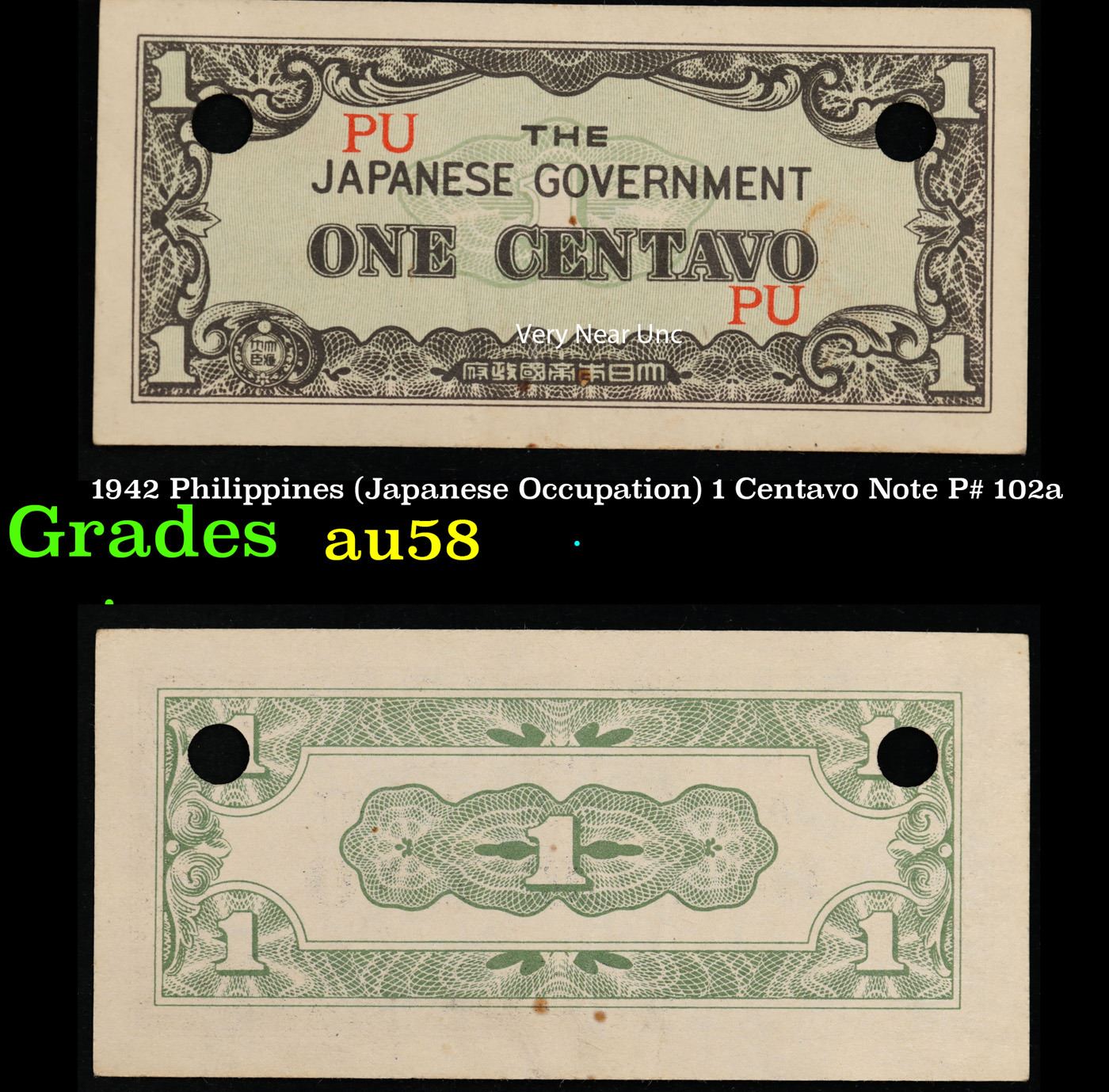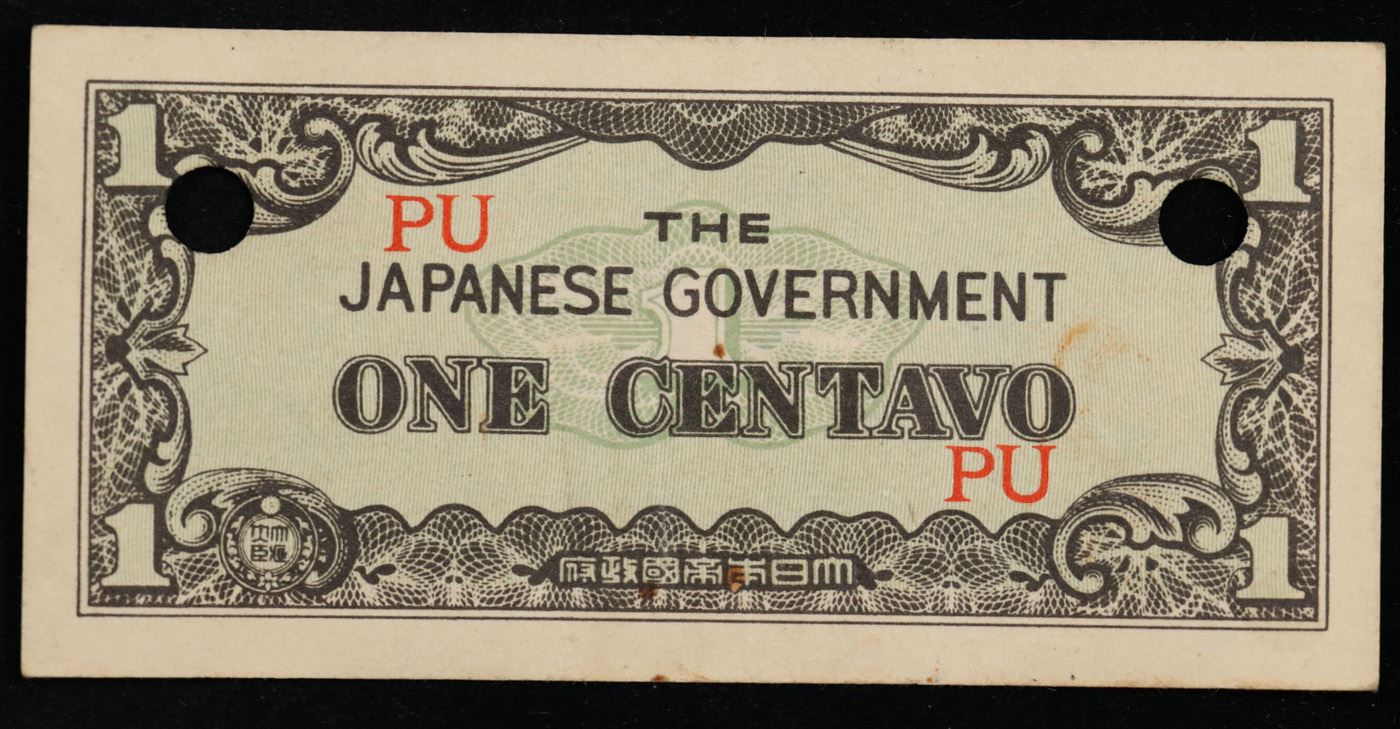 1942 Philippines (Japanese Occupation) 1 Centavo Note P# 102a Grades Choice AU/BU Slider. Japanese invasion money, officially known as Southern Development Bank Notes (Japanese: ??????? Dai T?-A Sens? gunpy?, "Greater East Asia War military scrip"), was currency issued by the Japanese Military Authority as a replacement for local currency after the conquest of colonies and other states in World War II. Japan printed this currency for many countries, including Malaysia, Singapore, North Borneo, Sarawak, Burma, Brunei, and several Oceania territories controlled by Australia.