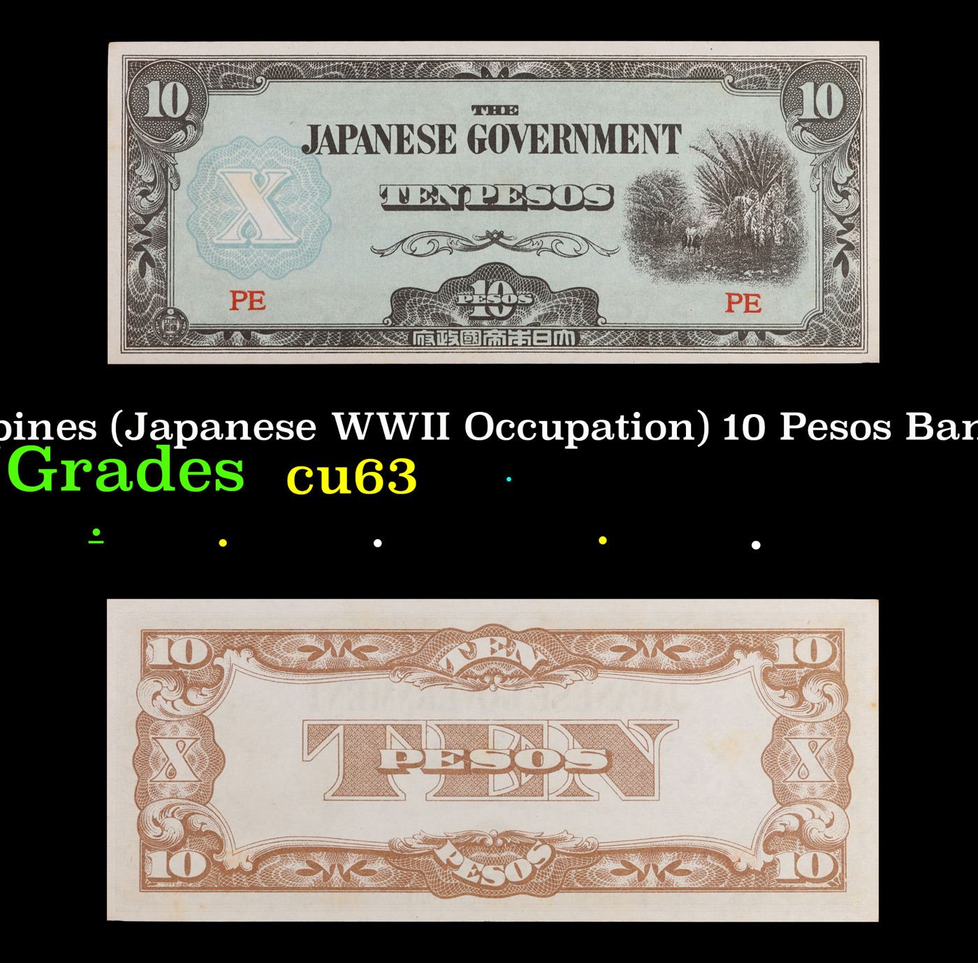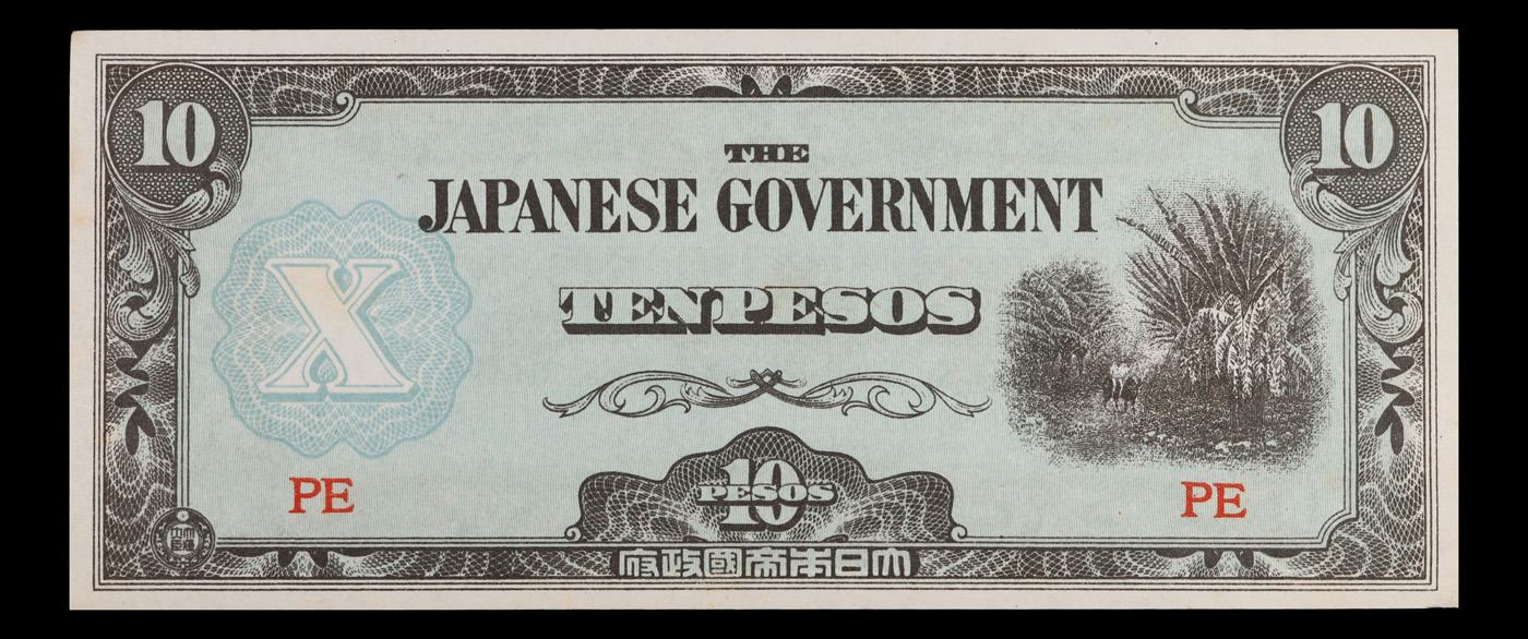 1942 Philippines (Japanese WWII Occupation) 10 Pesos Banknote P#?108 Grades Select CU. Japanese invasion money, officially known as Southern Development Bank Notes (Japanese: ??????? Dai T?-A Sens? gunpy?, "Greater East Asia War military scrip"), was currency issued by the Japanese Military Authority as a replacement for local currency after the conquest of colonies and other states in World War II. Japan printed this currency for many countries, including Malaysia, Singapore, North Borneo, Sarawak, Burma, Brunei, and several Oceania territories controlled by Australia. Some Japanese invasion notes are actually counterfeits produced by the American Office of Strategic Services or the British Special Operations Executive, meant to flood and destabilize the economy in the occupied areas, sometimes also including propaganda printed on the notes themselves.