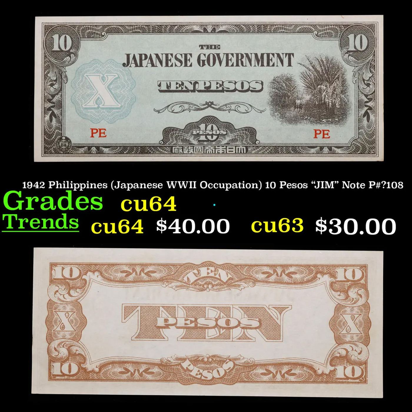 1942 Philippines (Japanese WWII Occupation) 10 Pesos "JIM" Note P#?108 Grades Choice CU