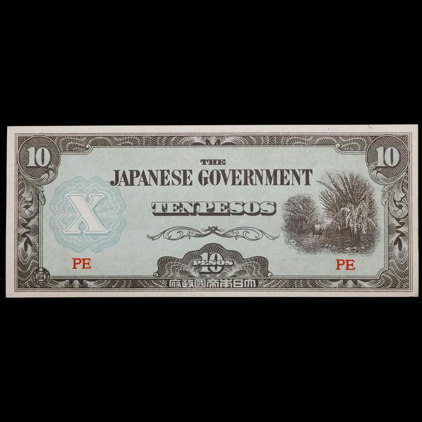 1942 Philippines (Japanese WWII Occupation) 10 Pesos "JIM" Note P#?108 Grades Choice CU. Japanese invasion money, officially known as Southern Development Bank Notes (Japanese: ??????? Dai T?-A Sens? gunpy?, "Greater East Asia War military scrip"), was currency issued by the Japanese Military Authority as a replacement for local currency after the conquest of colonies and other states in World War II. Japan printed this currency for many countries, including Malaysia, Singapore, North Borneo, Sarawak, Burma, Brunei, and several Oceania territories controlled by Australia. Some Japanese invasion notes are actually counterfeits produced by the American Office of Strategic Services or the British Special Operations Executive, meant to flood and destabilize the economy in the occupied areas, sometimes also including propaganda printed on the notes themselves.