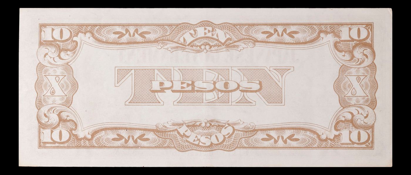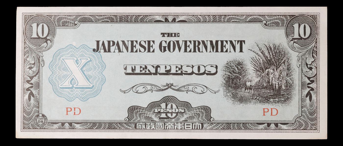 1942 Philippines (Japanese WWII Occupation) 10 Pesos "JIM" Note P#?108 Grades Select CU. Japanese invasion money, officially known as Southern Development Bank Notes (Japanese: ??????? Dai T?-A Sens? gunpy?, "Greater East Asia War military scrip"), was currency issued by the Japanese Military Authority as a replacement for local currency after the conquest of colonies and other states in World War II. Japan printed this currency for many countries, including Malaysia, Singapore, North Borneo, Sarawak, Burma, Brunei, and several Oceania territories controlled by Australia. Some Japanese invasion notes are actually counterfeits produced by the American Office of Strategic Services or the British Special Operations Executive, meant to flood and destabilize the economy in the occupied areas, sometimes also including propaganda printed on the notes themselves.