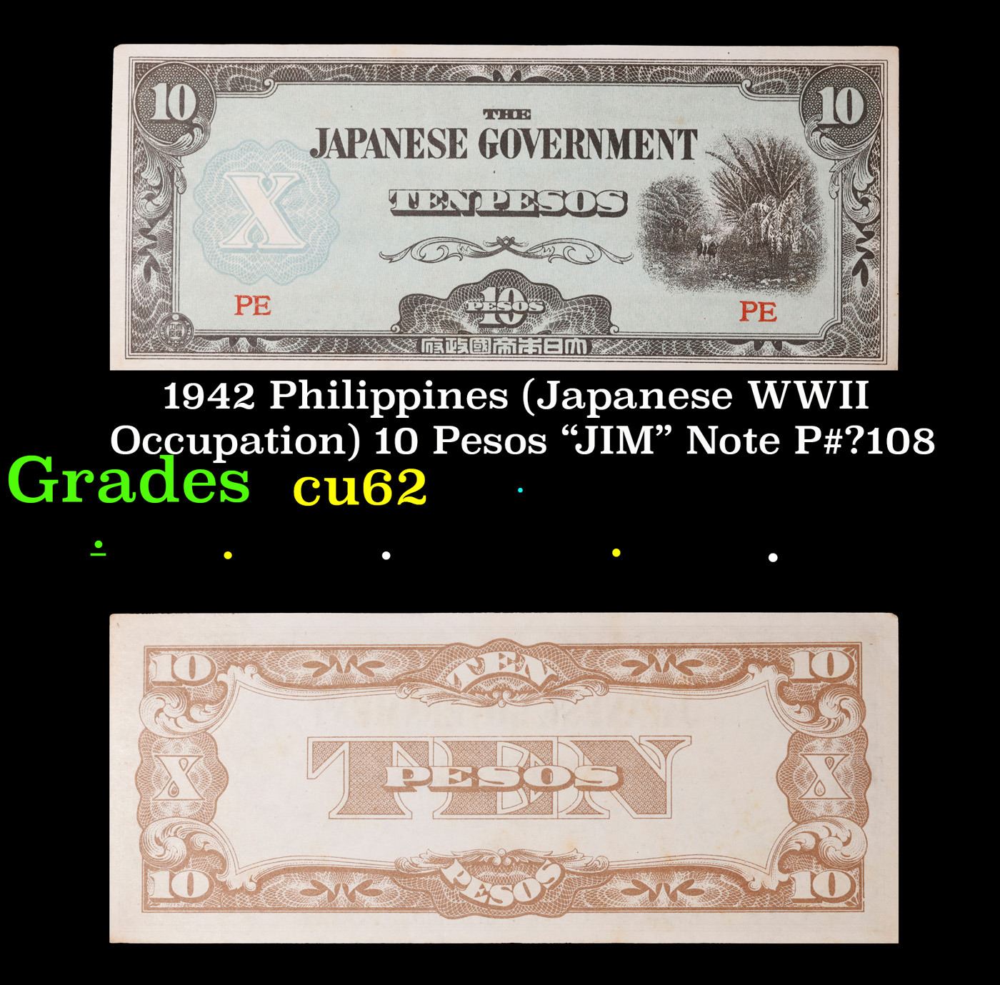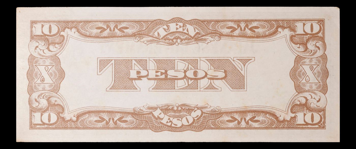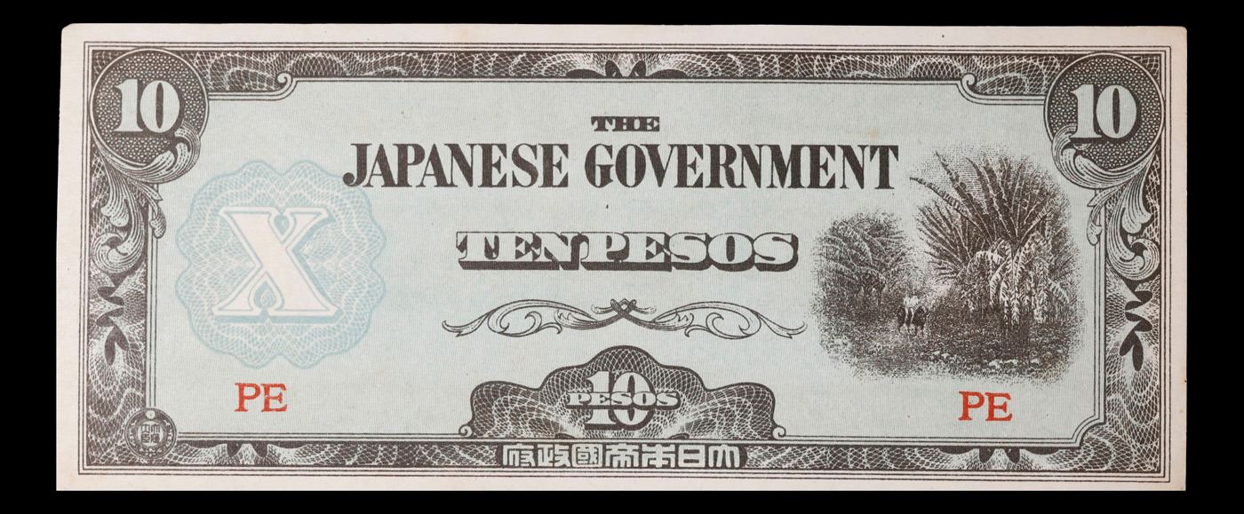 1942 Philippines (Japanese WWII Occupation) 10 Pesos "JIM" Note P#?108 Grades Select CU. Japanese invasion money, officially known as Southern Development Bank Notes (Japanese: ??????? Dai T?-A Sens? gunpy?, "Greater East Asia War military scrip"), was currency issued by the Japanese Military Authority as a replacement for local currency after the conquest of colonies and other states in World War II. Japan printed this currency for many countries, including Malaysia, Singapore, North Borneo, Sarawak, Burma, Brunei, and several Oceania territories controlled by Australia. Some Japanese invasion notes are actually counterfeits produced by the American Office of Strategic Services or the British Special Operations Executive, meant to flood and destabilize the economy in the occupied areas, sometimes also including propaganda printed on the notes themselves.
