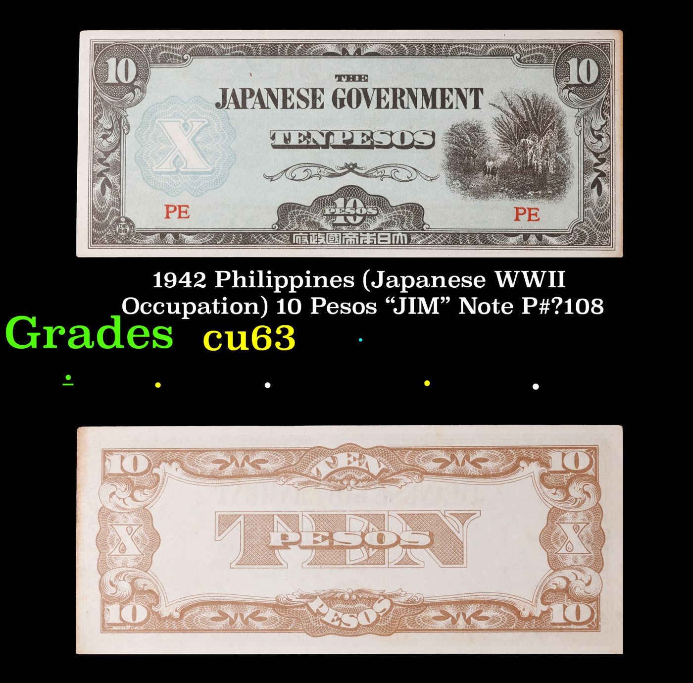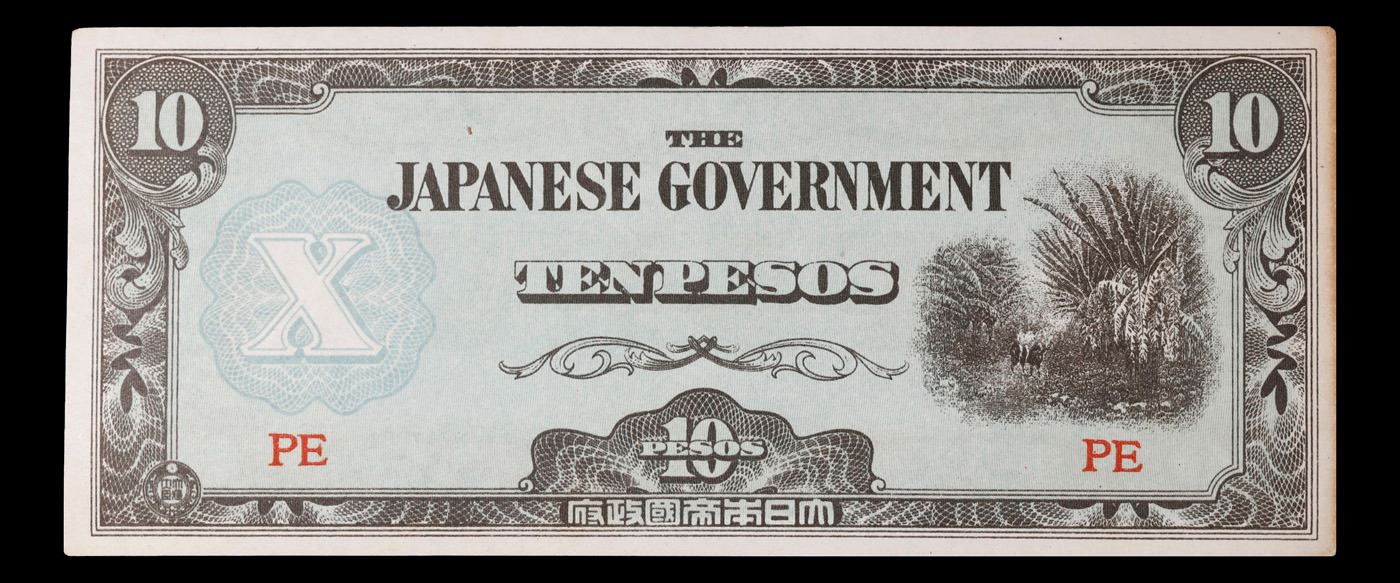 1942 Philippines (Japanese WWII Occupation) 10 Pesos "JIM" Note P#?108 Grades Select CU. Japanese invasion money, officially known as Southern Development Bank Notes (Japanese: ??????? Dai T?-A Sens? gunpy?, "Greater East Asia War military scrip"), was currency issued by the Japanese Military Authority as a replacement for local currency after the conquest of colonies and other states in World War II. Japan printed this currency for many countries, including Malaysia, Singapore, North Borneo, Sarawak, Burma, Brunei, and several Oceania territories controlled by Australia. Some Japanese invasion notes are actually counterfeits produced by the American Office of Strategic Services or the British Special Operations Executive, meant to flood and destabilize the economy in the occupied areas, sometimes also including propaganda printed on the notes themselves.