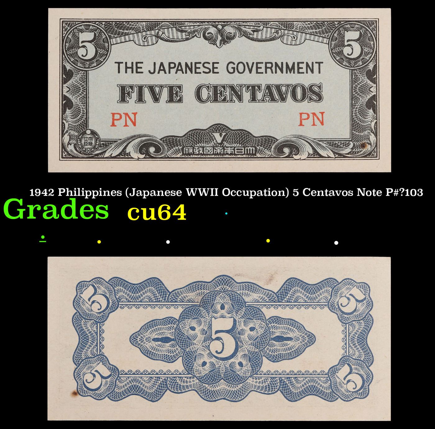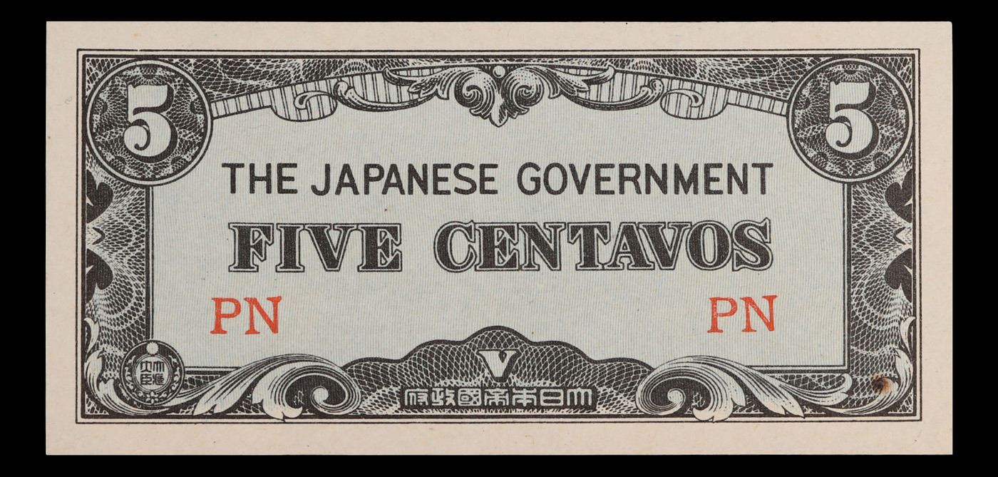 1942 Philippines (Japanese WWII Occupation) 5 Centavos Note P#_103 Grades Choice CU. Japanese invasion money, officially known as Southern Development Bank Notes (Japanese: _______ Dai T_-A Sens_ gunpy_, "Greater East Asia War military scrip"), was currency issued by the Japanese Military Authority as a replacement for local currency after the conquest of colonies and other states in World War II. Japan printed this currency for many countries, including Malaysia, Singapore, North Borneo, Sarawak, Burma, Brunei, and several Oceania territories controlled by Australia. Some Japanese invasion notes are actually counterfeits produced by the American Office of Strategic Services or the British Special Operations Executive, meant to flood and destabilize the economy in the occupied areas, sometimes also including propaganda printed on the notes themselves.