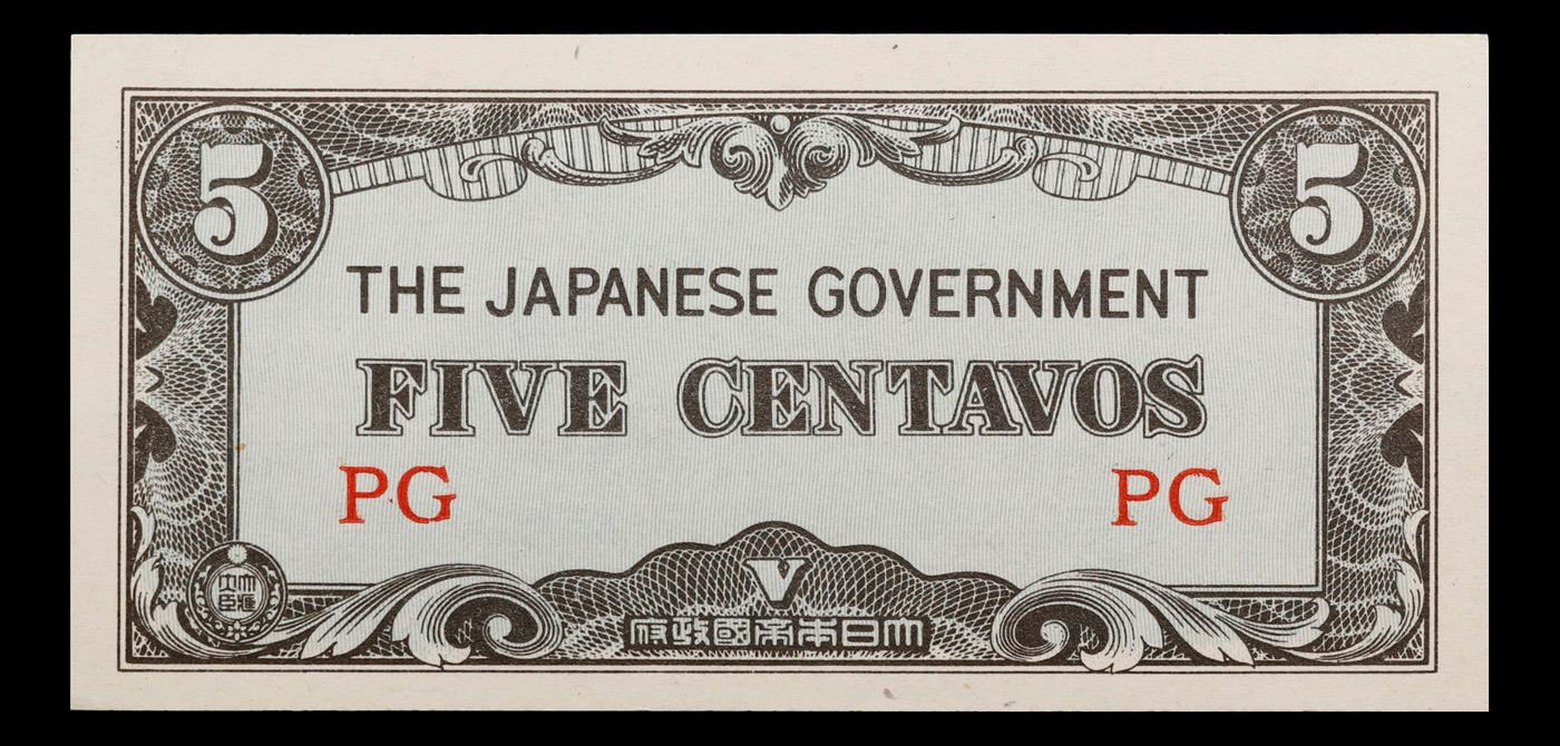 1942 Philippines (Japanese WWII Occupation) 5 Centavos Note P#?103 Grades Select CU. Japanese invasion money, officially known as Southern Development Bank Notes (Japanese: ??????? Dai T?-A Sens? gunpy?, "Greater East Asia War military scrip"), was currency issued by the Japanese Military Authority as a replacement for local currency after the conquest of colonies and other states in World War II. Japan printed this currency for many countries, including Malaysia, Singapore, North Borneo, Sarawak, Burma, Brunei, and several Oceania territories controlled by Australia. Some Japanese invasion notes are actually counterfeits produced by the American Office of Strategic Services or the British Special Operations Executive, meant to flood and destabilize the economy in the occupied areas, sometimes also including propaganda printed on the notes themselves.