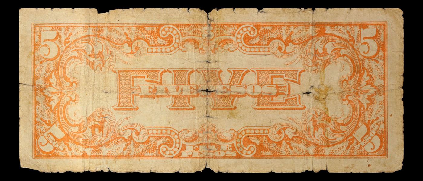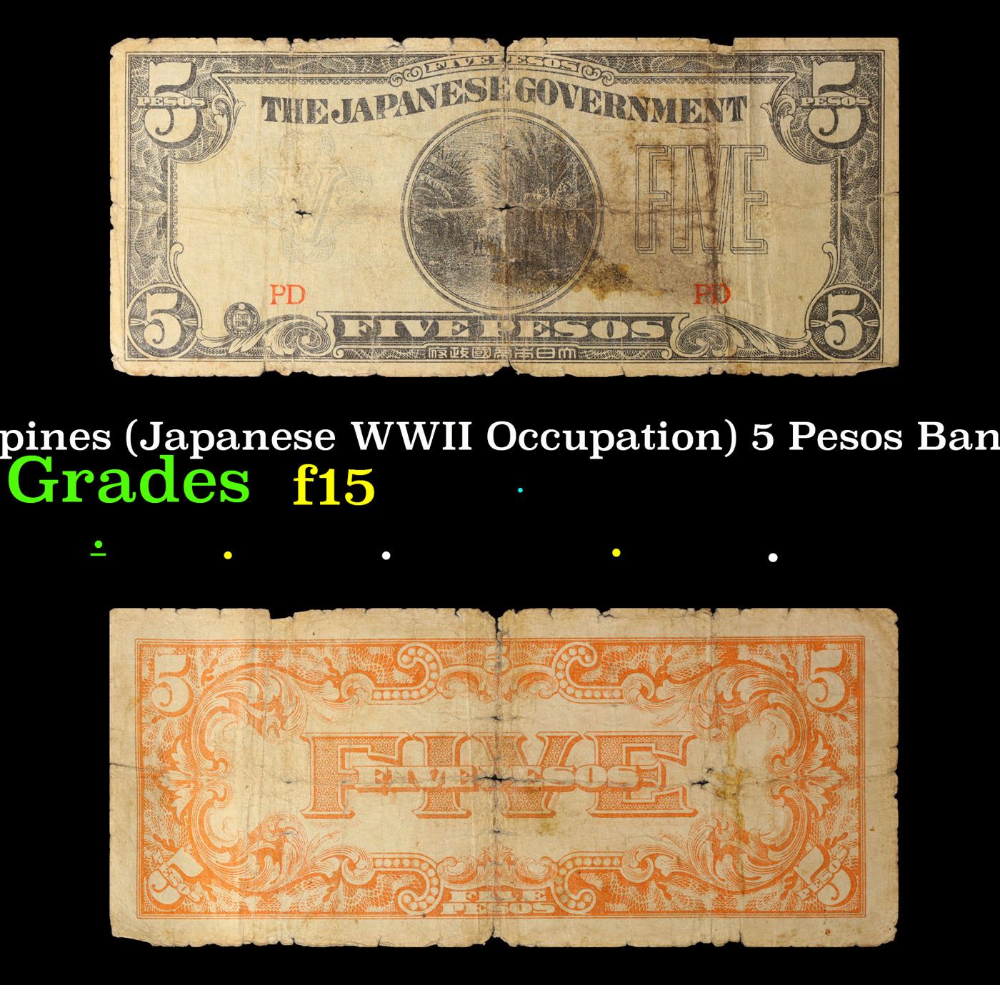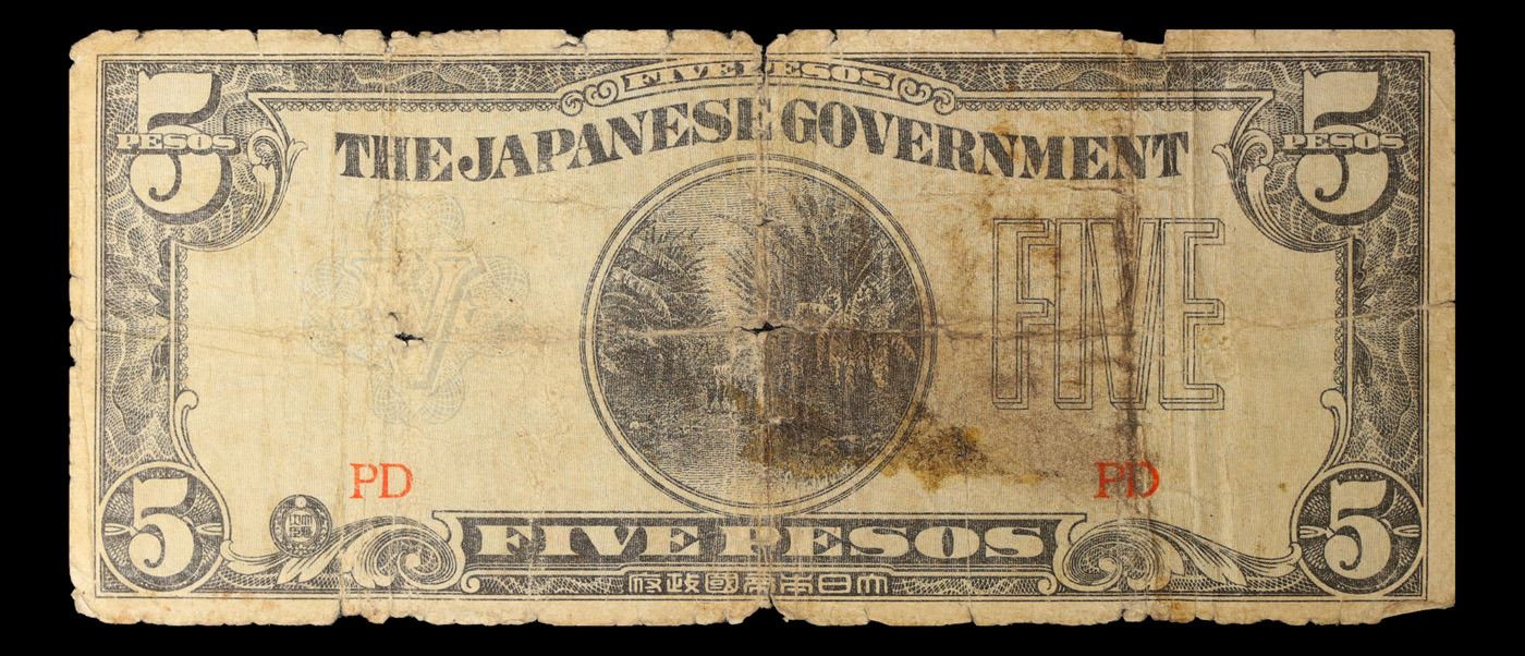 1942 Philippines (Japanese WWII Occupation) 5 Pesos Banknote P#?107 Grades f+. Japanese invasion money, officially known as Southern Development Bank Notes (Japanese: ??????? Dai T?-A Sens? gunpy?, "Greater East Asia War military scrip"), was currency issued by the Japanese Military Authority as a replacement for local currency after the conquest of colonies and other states in World War II. Japan printed this currency for many countries, including Malaysia, Singapore, North Borneo, Sarawak, Burma, Brunei, and several Oceania territories controlled by Australia. Some Japanese invasion notes are actually counterfeits produced by the American Office of Strategic Services or the British Special Operations Executive, meant to flood and destabilize the economy in the occupied areas, sometimes also including propaganda printed on the notes themselves.