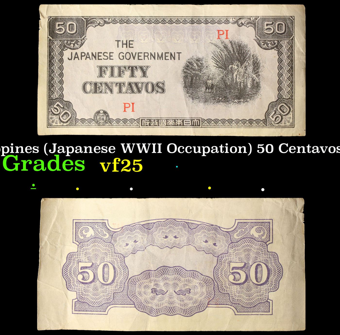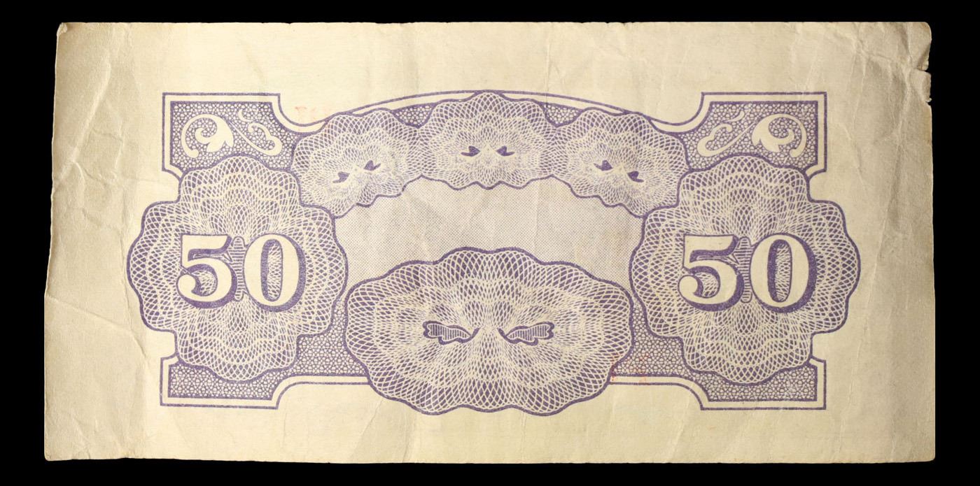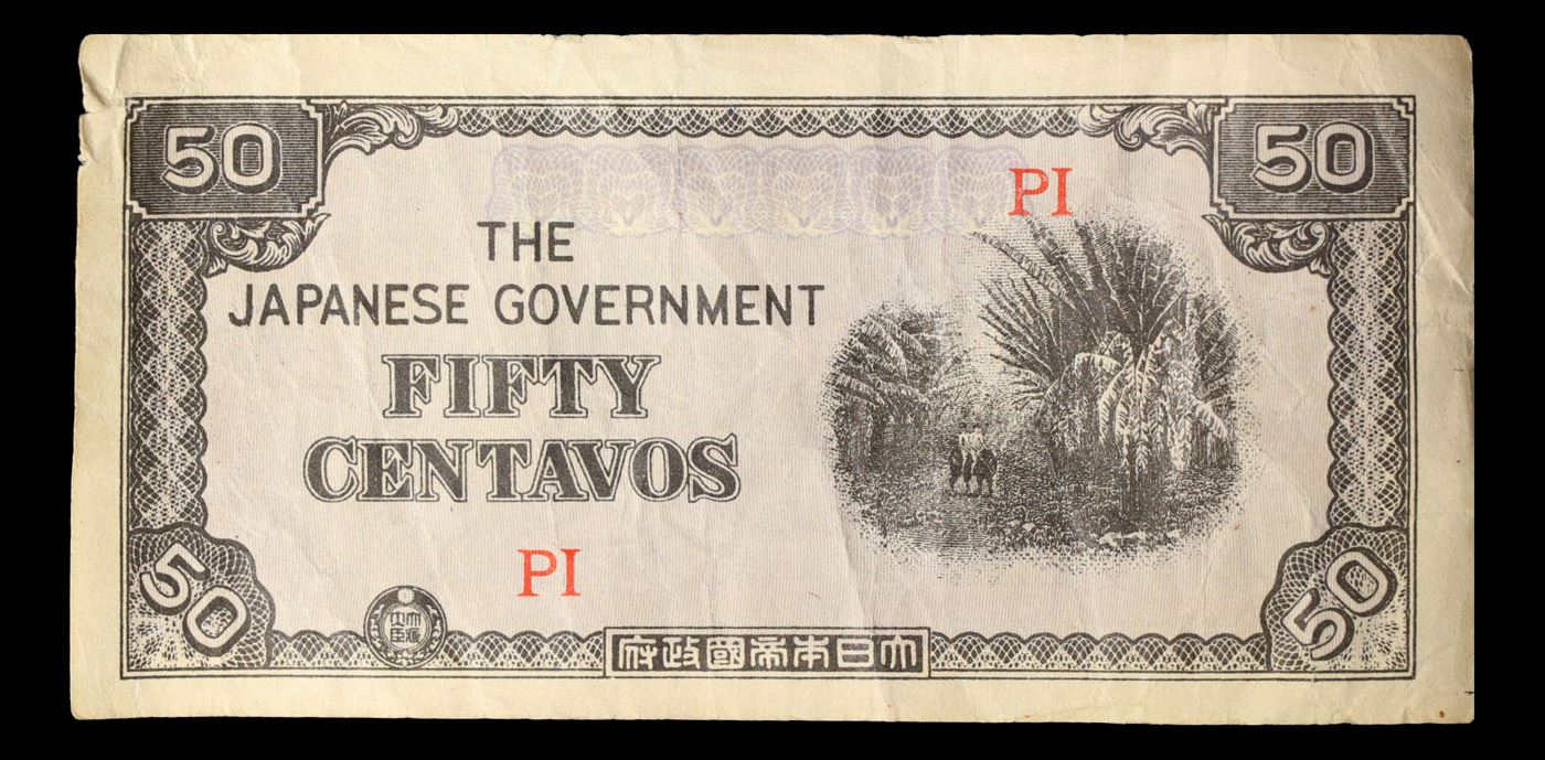 1942 Philippines (Japanese WWII Occupation) 50 Centavos Note P#?105 Grades vf+. Japanese invasion money, officially known as Southern Development Bank Notes (Japanese: ??????? Dai T?-A Sens? gunpy?, "Greater East Asia War military scrip"), was currency issued by the Japanese Military Authority as a replacement for local currency after the conquest of colonies and other states in World War II. Japan printed this currency for many countries, including Malaysia, Singapore, North Borneo, Sarawak, Burma, Brunei, and several Oceania territories controlled by Australia. Some Japanese invasion notes are actually counterfeits produced by the American Office of Strategic Services or the British Special Operations Executive, meant to flood and destabilize the economy in the occupied areas, sometimes also including propaganda printed on the notes themselves.