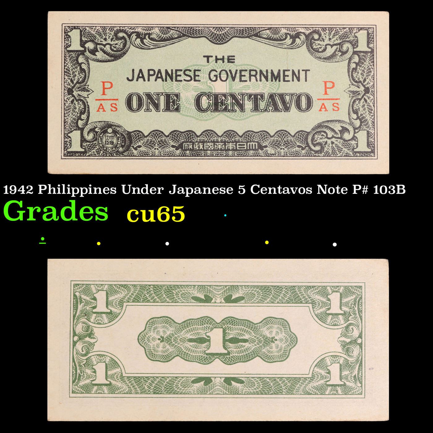 1942 Philippines Under Japanese 5 Centavos Note P# 103B Grades Gem CU. Japanese invasion money, officially known as Southern Development Bank Notes (Japanese: ??????? Dai T?-A Sens? gunpy?, "Greater East Asia War military scrip"), was currency issued by the Japanese Military Authority as a replacement for local currency after the conquest of colonies and other states in World War II. Japan printed this currency for many countries, including Malaysia, Singapore, North Borneo, Sarawak, Burma, Brunei, and several Oceania territories controlled by Australia.