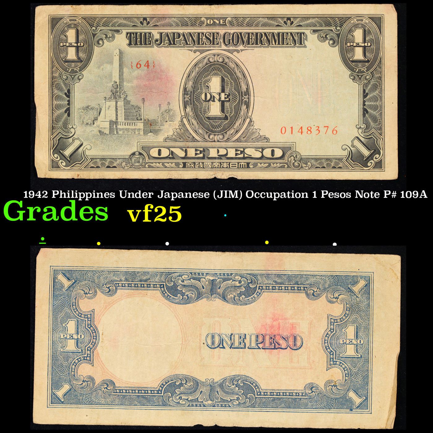 1942 Philippines Under Japanese (JIM) Occupation 1 Pesos Note P# 109A Grades vf+. Japanese invasion money, officially known as Southern Development Bank Notes (Japanese: ??????? Dai T?-A Sens? gunpy?, "Greater East Asia War military scrip"), was currency issued by the Japanese Military Authority as a replacement for local currency after the conquest of colonies and other states in World War II. Japan printed this currency for many countries, including Malaysia, Singapore, North Borneo, Sarawak, Burma, Brunei, and several Oceania territories controlled by Australia.