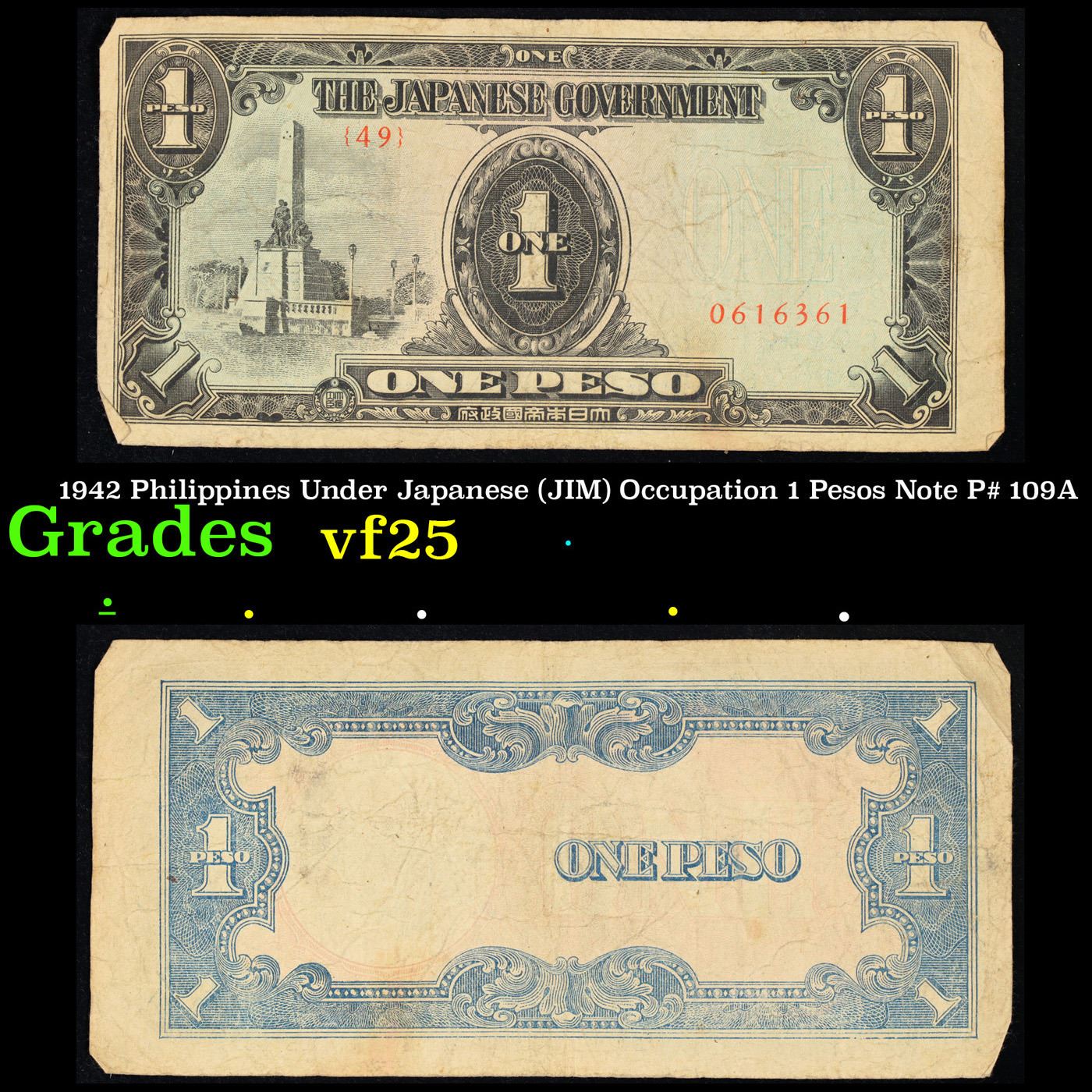 1942 Philippines Under Japanese (JIM) Occupation 1 Pesos Note P# 109A Grades vf+. Japanese invasion money, officially known as Southern Development Bank Notes (Japanese: ??????? Dai T?-A Sens? gunpy?, "Greater East Asia War military scrip"), was currency issued by the Japanese Military Authority as a replacement for local currency after the conquest of colonies and other states in World War II. Japan printed this currency for many countries, including Malaysia, Singapore, North Borneo, Sarawak, Burma, Brunei, and several Oceania territories controlled by Australia.