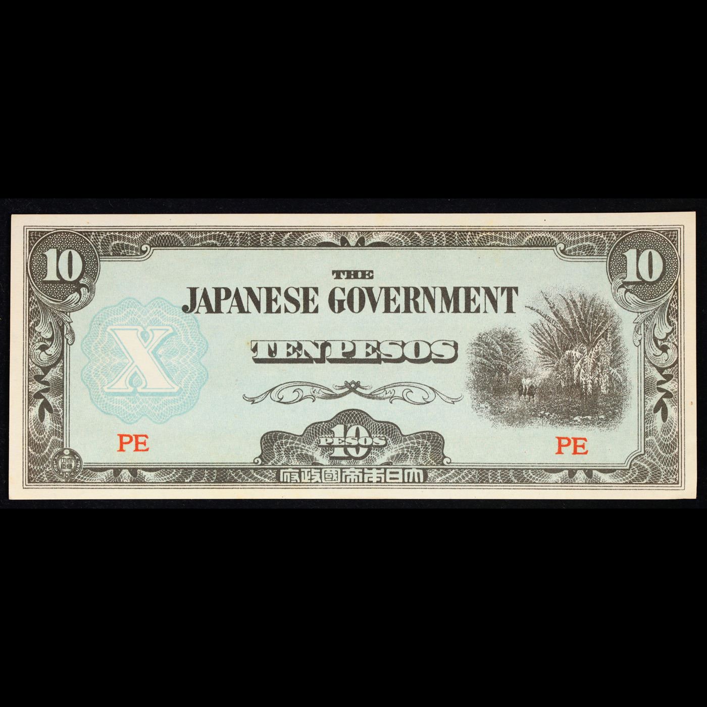 1942 Philippines Under Japanese (JIM) Occupation 10 Pesos Note P# 108A Grades Select CU. Japanese invasion money, officially known as Southern Development Bank Notes (Japanese: ??????? Dai T?-A Sens? gunpy?, "Greater East Asia War military scrip"), was currency issued by the Japanese Military Authority as a replacement for local currency after the conquest of colonies and other states in World War II. Japan printed this currency for many countries, including Malaysia, Singapore, North Borneo, Sarawak, Burma, Brunei, and several Oceania territories controlled by Australia.