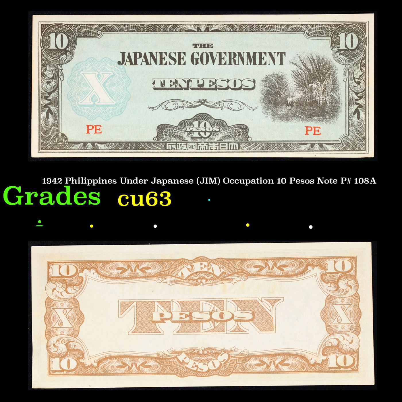 1942 Philippines Under Japanese (JIM) Occupation 10 Pesos Note P# 108A Grades Select CU. Japanese invasion money, officially known as Southern Development Bank Notes (Japanese: ??????? Dai T?-A Sens? gunpy?, "Greater East Asia War military scrip"), was currency issued by the Japanese Military Authority as a replacement for local currency after the conquest of colonies and other states in World War II. Japan printed this currency for many countries, including Malaysia, Singapore, North Borneo, Sarawak, Burma, Brunei, and several Oceania territories controlled by Australia.