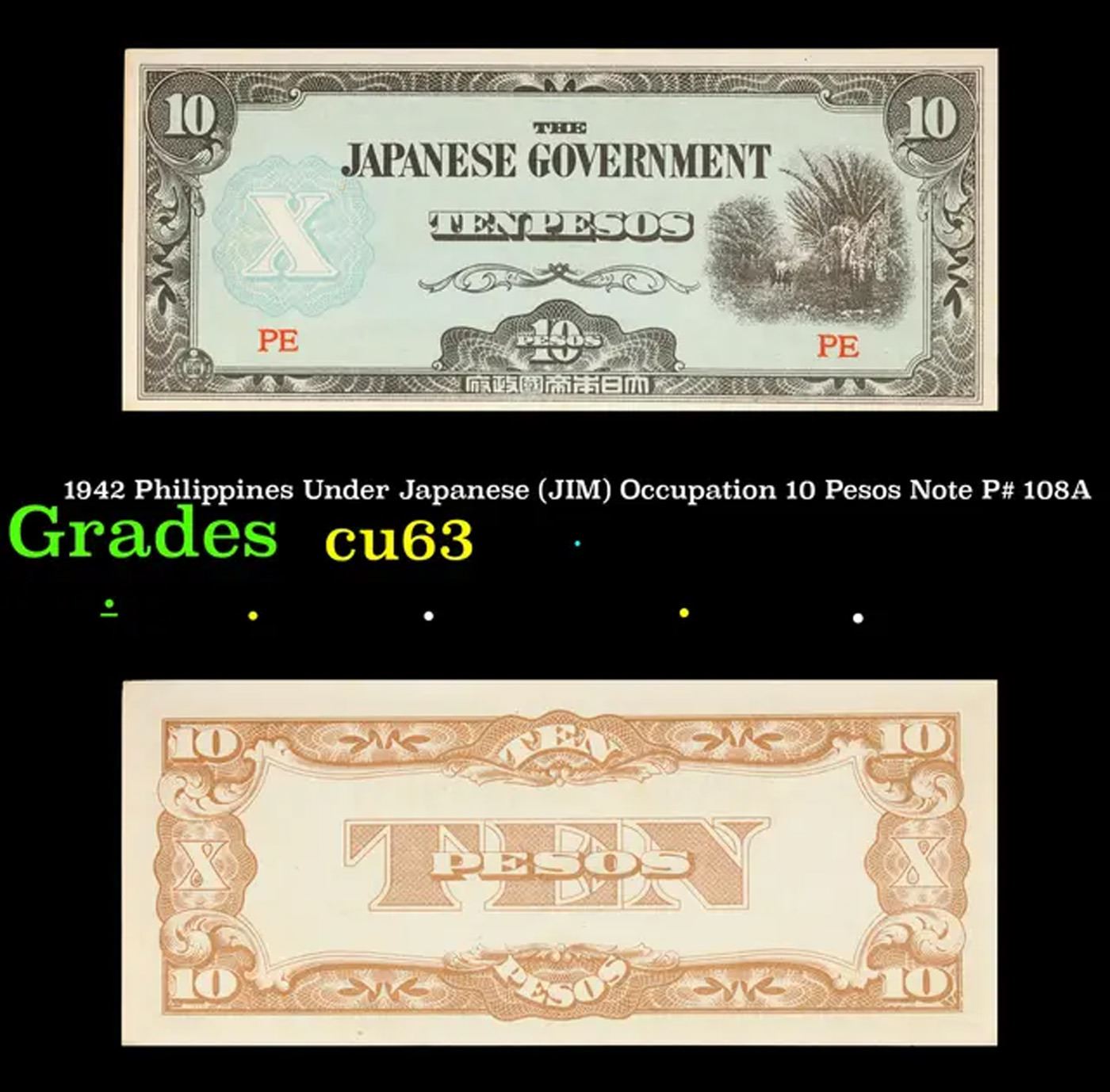 1942 Philippines Under Japanese (JIM) Occupation 10 Pesos Note P# 108A Grades Select CU