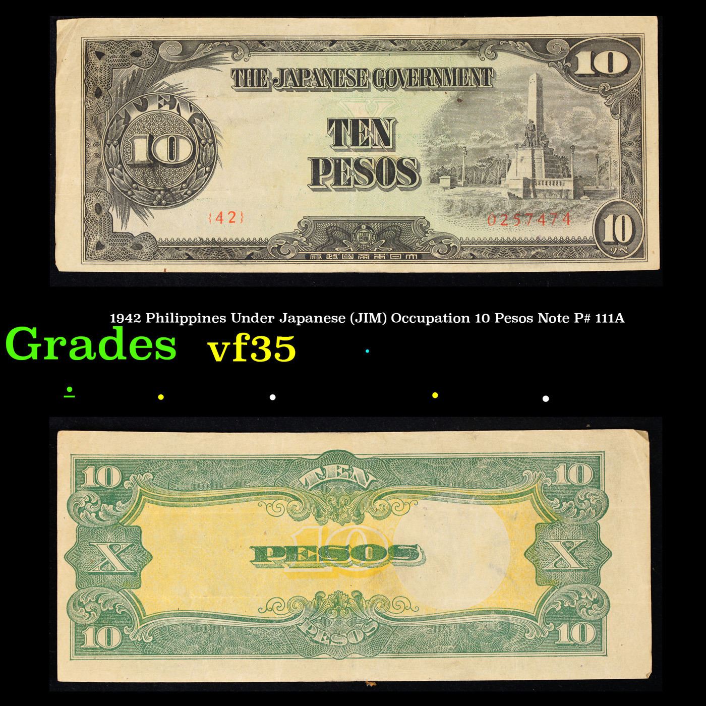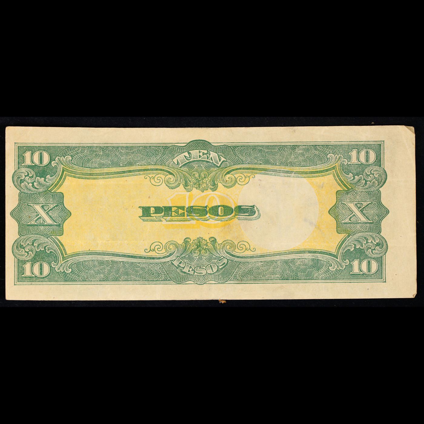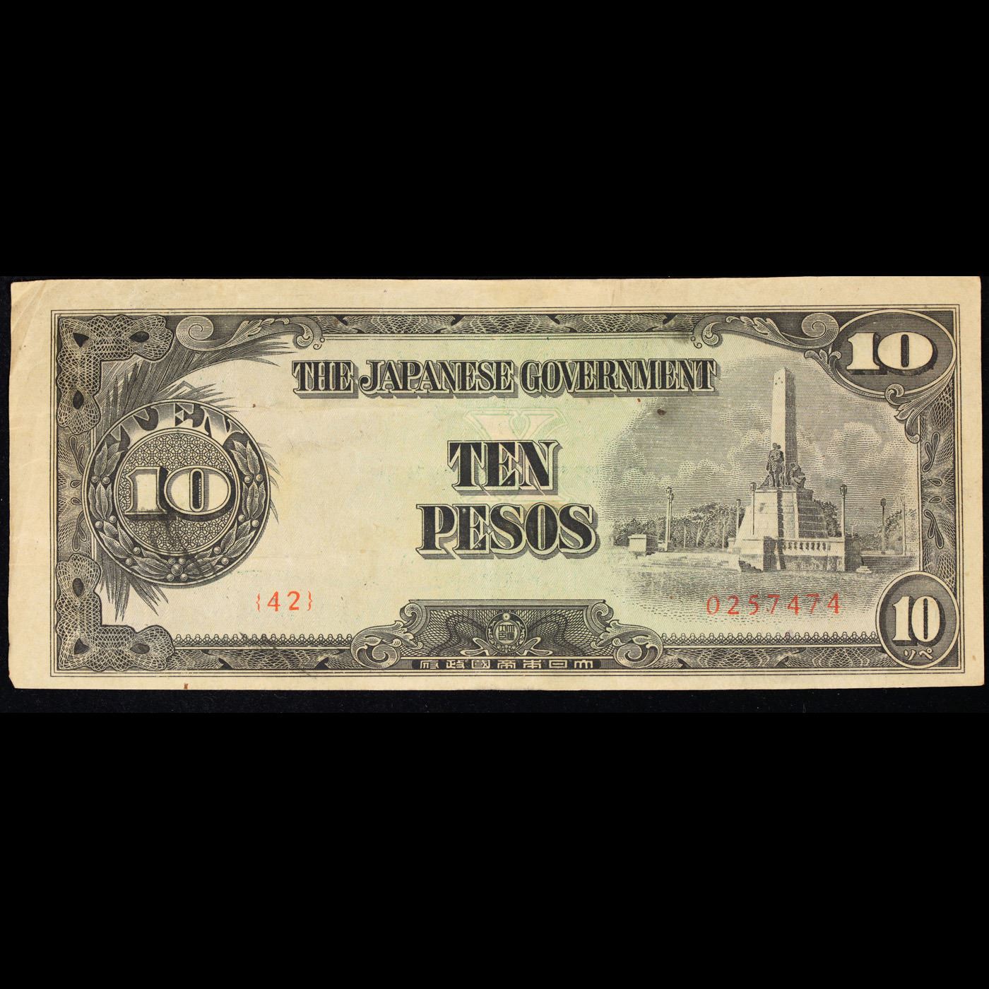1942 Philippines Under Japanese (JIM) Occupation 10 Pesos Note P# 111A Grades vf++. Japanese invasion money, officially known as Southern Development Bank Notes (Japanese: ??????? Dai T?-A Sens? gunpy?, "Greater East Asia War military scrip"), was currency issued by the Japanese Military Authority as a replacement for local currency after the conquest of colonies and other states in World War II. Japan printed this currency for many countries, including Malaysia, Singapore, North Borneo, Sarawak, Burma, Brunei, and several Oceania territories controlled by Australia.