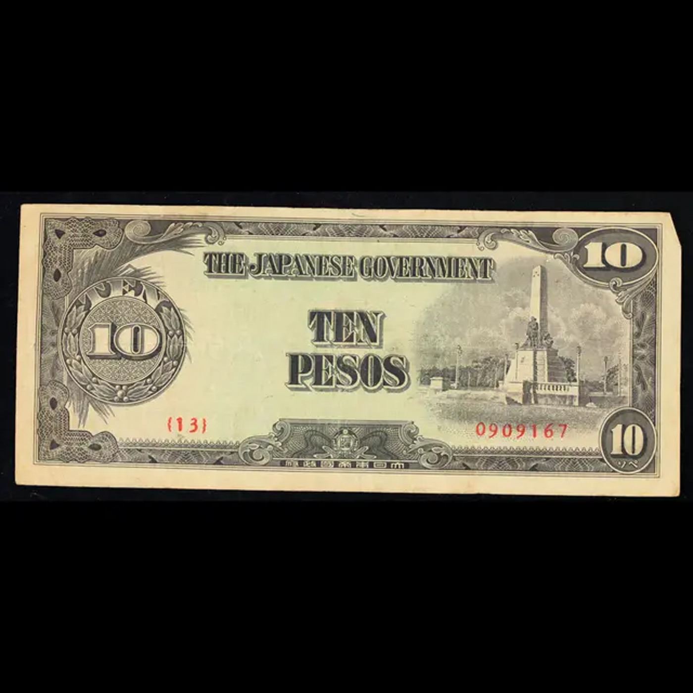 1942 Philippines Under Japanese (JIM) Occupation 10 Pesos Note P# 111A Grades vf+. Japanese invasion money, officially known as Southern Development Bank Notes (Japanese: ??????? Dai T?-A Sens? gunpy?, "Greater East Asia War military scrip"), was currency issued by the Japanese Military Authority as a replacement for local currency after the conquest of colonies and other states in World War II. Japan printed this currency for many countries, including Malaysia, Singapore, North Borneo, Sarawak, Burma, Brunei, and several Oceania territories controlled by Australia.
