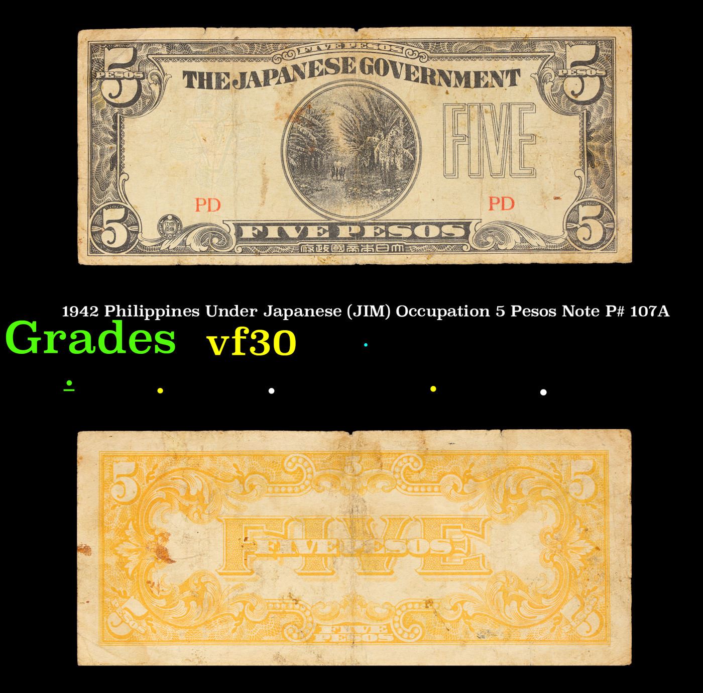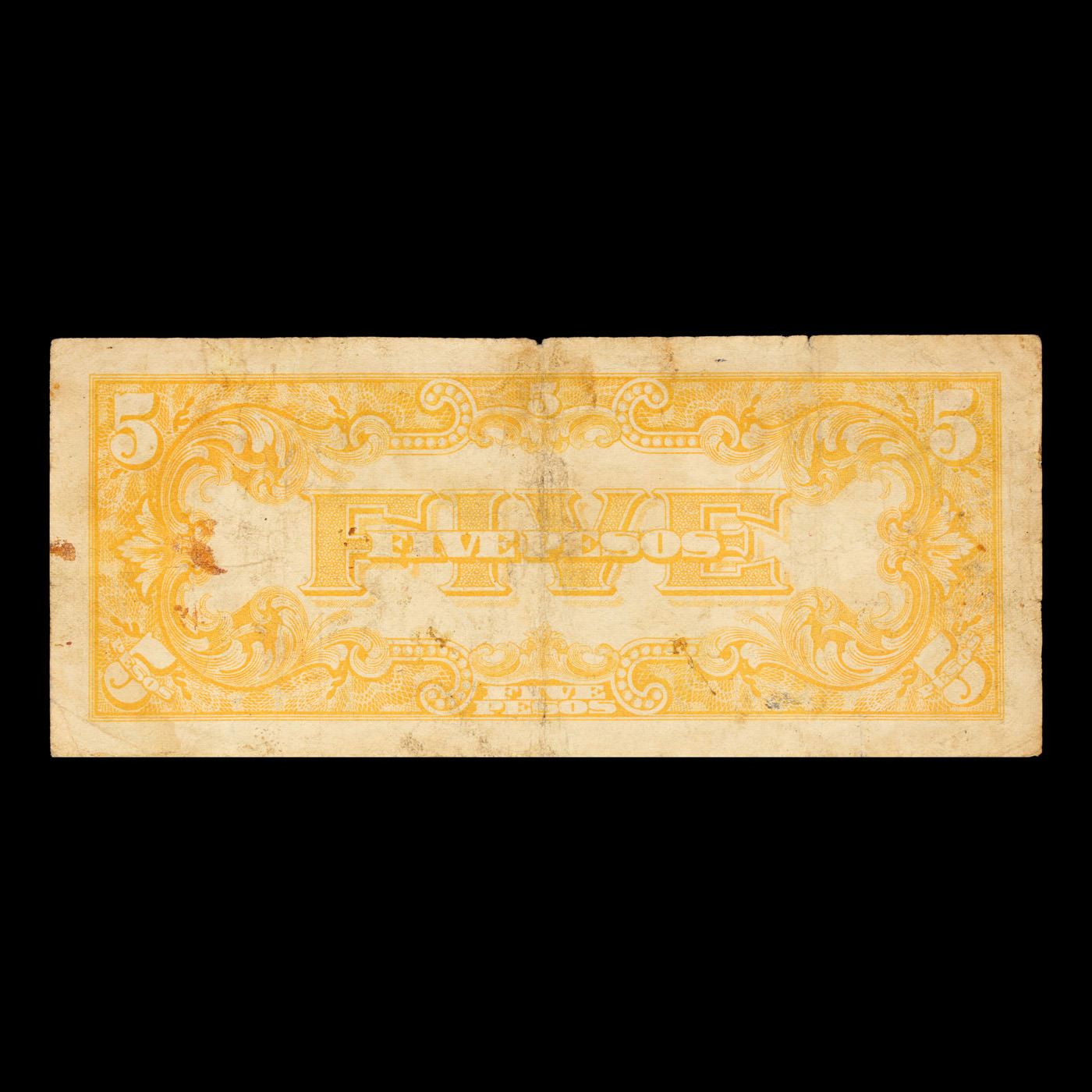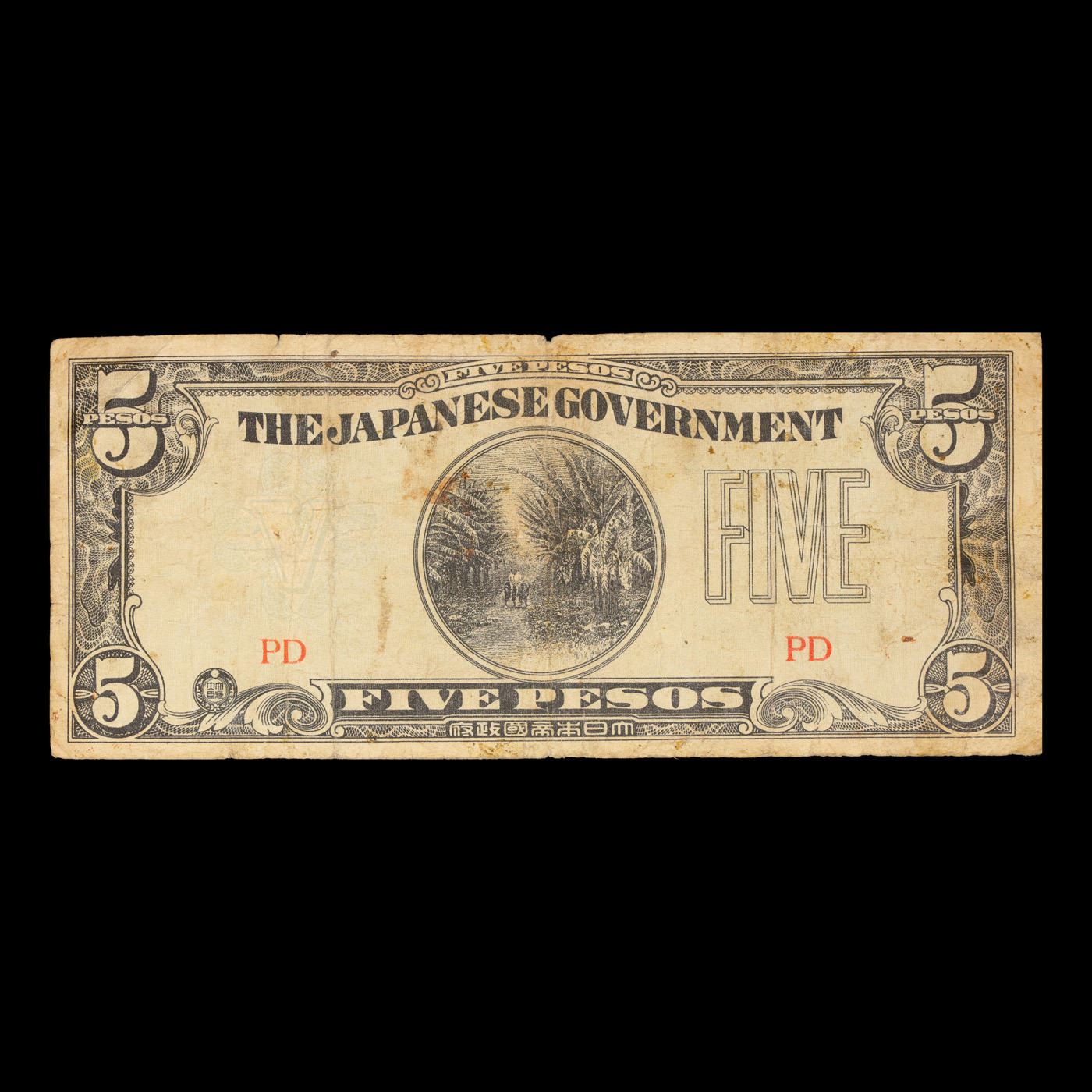 1942 Philippines Under Japanese (JIM) Occupation 5 Pesos Note P# 107A Grades vf++. Japanese invasion money, officially known as Southern Development Bank Notes (Japanese: ??????? Dai T?-A Sens? gunpy?, "Greater East Asia War military scrip"), was currency issued by the Japanese Military Authority as a replacement for local currency after the conquest of colonies and other states in World War II. Japan printed this currency for many countries, including Malaysia, Singapore, North Borneo, Sarawak, Burma, Brunei, and several Oceania territories controlled by Australia.