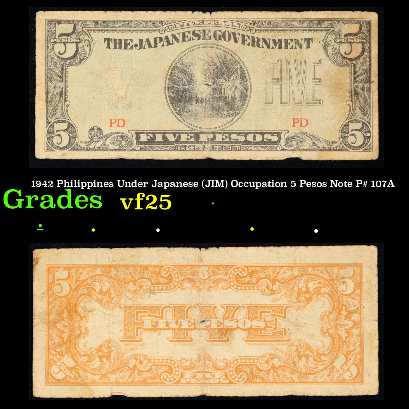 1942 Philippines Under Japanese (JIM) Occupation 5 Pesos Note P# 107A Grades vf+. Japanese invasion money, officially known as Southern Development Bank Notes (Japanese: ??????? Dai T?-A Sens? gunpy?, "Greater East Asia War military scrip"), was currency issued by the Japanese Military Authority as a replacement for local currency after the conquest of colonies and other states in World War II. Japan printed this currency for many countries, including Malaysia, Singapore, North Borneo, Sarawak, Burma, Brunei, and several Oceania territories controlled by Australia.