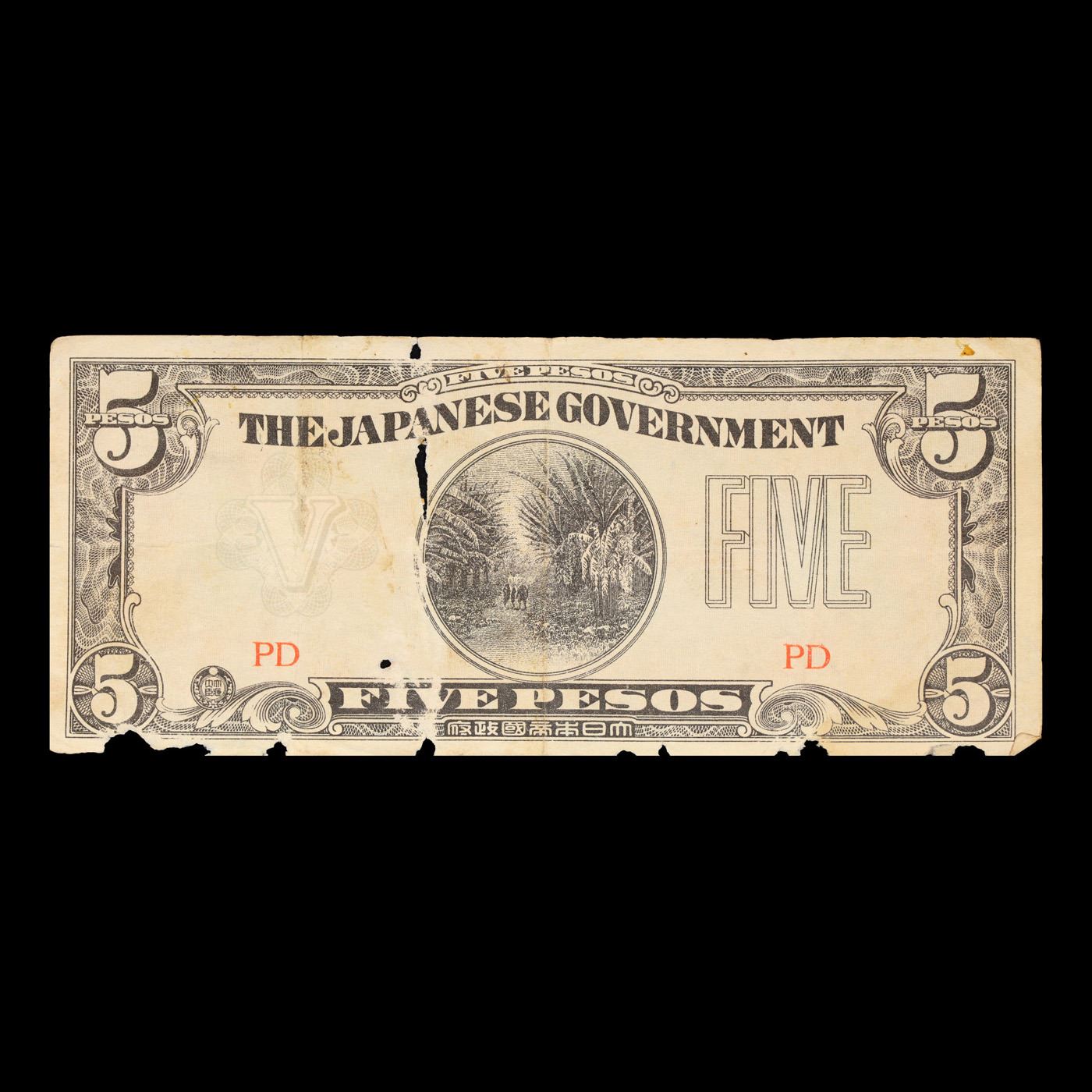 1942 Philippines Under Japanese (JIM) Occupation 5 Pesos Note P# 107A Grades xf details. Japanese invasion money, officially known as Southern Development Bank Notes (Japanese: ??????? Dai T?-A Sens? gunpy?, "Greater East Asia War military scrip"), was currency issued by the Japanese Military Authority as a replacement for local currency after the conquest of colonies and other states in World War II. Japan printed this currency for many countries, including Malaysia, Singapore, North Borneo, Sarawak, Burma, Brunei, and several Oceania territories controlled by Australia.