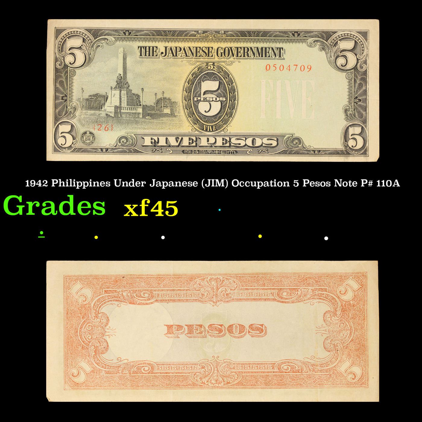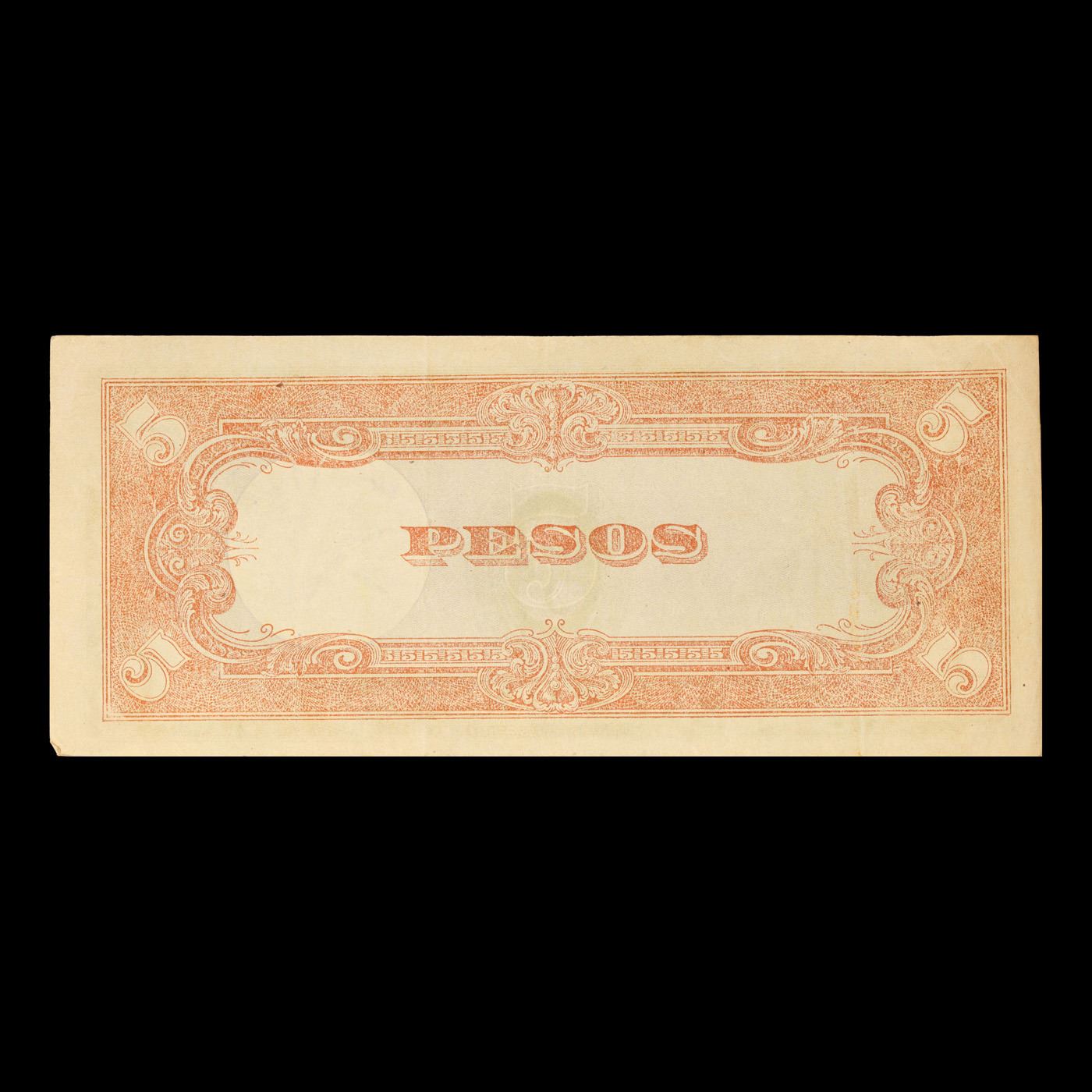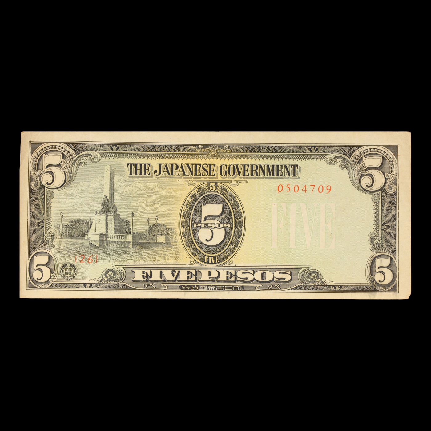 1942 Philippines Under Japanese (JIM) Occupation 5 Pesos Note P# 110A Grades xf+. Japanese invasion money, officially known as Southern Development Bank Notes (Japanese: ??????? Dai T?-A Sens? gunpy?, "Greater East Asia War military scrip"), was currency issued by the Japanese Military Authority as a replacement for local currency after the conquest of colonies and other states in World War II. Japan printed this currency for many countries, including Malaysia, Singapore, North Borneo, Sarawak, Burma, Brunei, and several Oceania territories controlled by Australia.