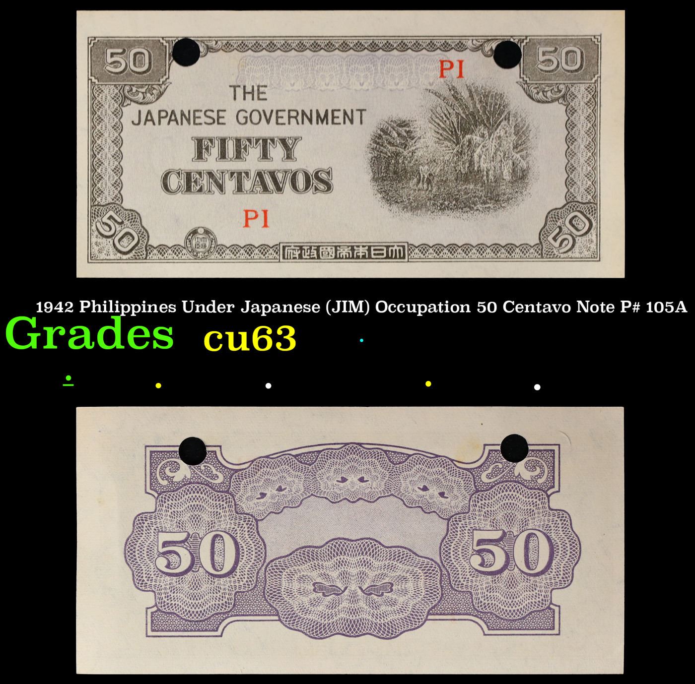 1942 Philippines Under Japanese (JIM) Occupation 50 Centavo Note P# 105A Grades Select CU