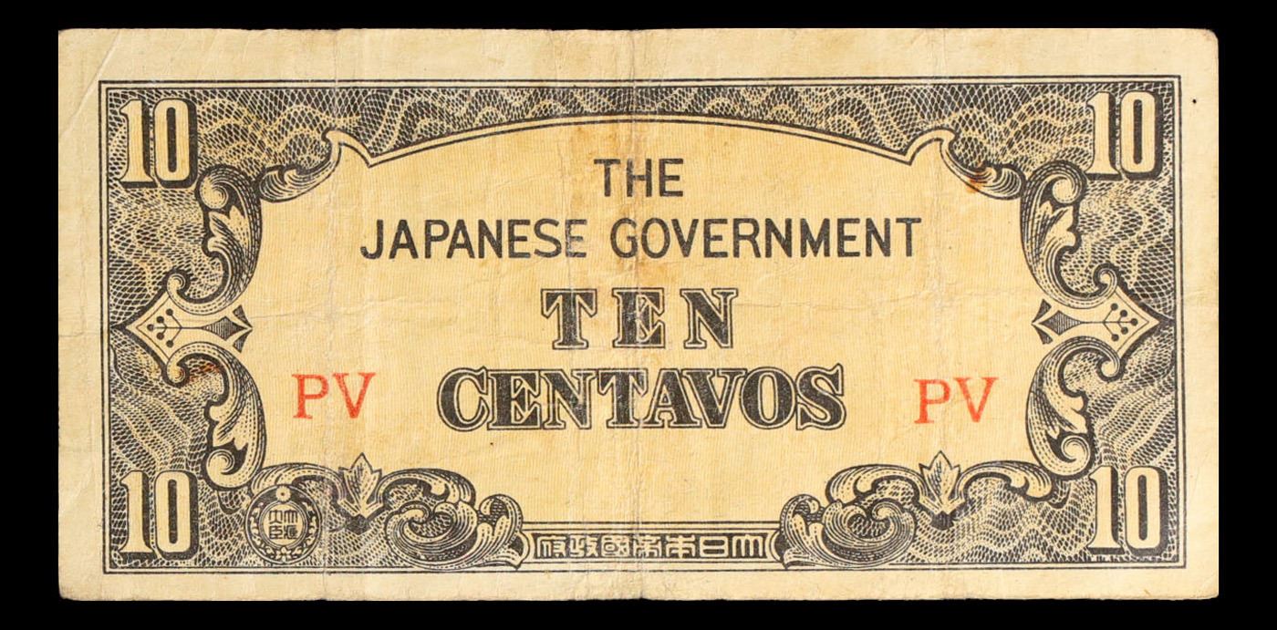 1942 Philippines Under Japanese Occupation 10 Centavos Note P# 104A Grades vf+. Japanese invasion money, officially known as Southern Development Bank Notes (Japanese: ??????? Dai T?-A Sens? gunpy?, "Greater East Asia War military scrip"), was currency issued by the Japanese Military Authority as a replacement for local currency after the conquest of colonies and other states in World War II. Japan printed this currency for many countries, including Malaysia, Singapore, North Borneo, Sarawak, Burma, Brunei, and several Oceania territories controlled by Australia.