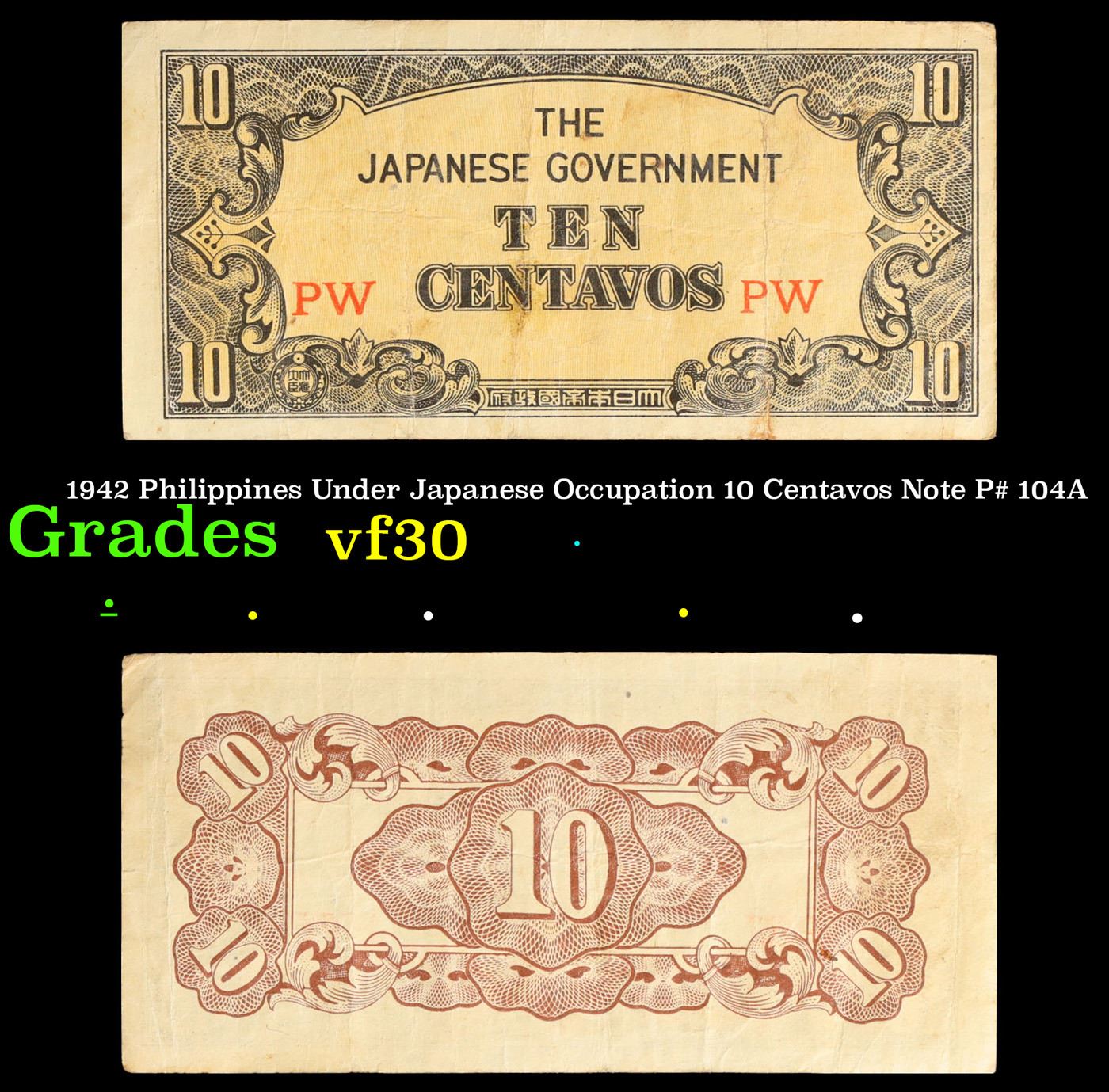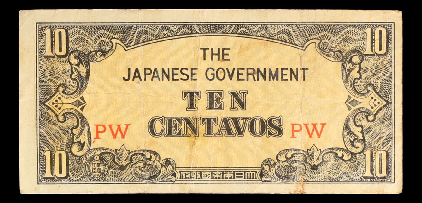 1942 Philippines Under Japanese Occupation 10 Centavos Note P# 104A Grades vf++. Japanese invasion money, officially known as Southern Development Bank Notes (Japanese: ??????? Dai T?-A Sens? gunpy?, "Greater East Asia War military scrip"), was currency issued by the Japanese Military Authority as a replacement for local currency after the conquest of colonies and other states in World War II. Japan printed this currency for many countries, including Malaysia, Singapore, North Borneo, Sarawak, Burma, Brunei, and several Oceania territories controlled by Australia.