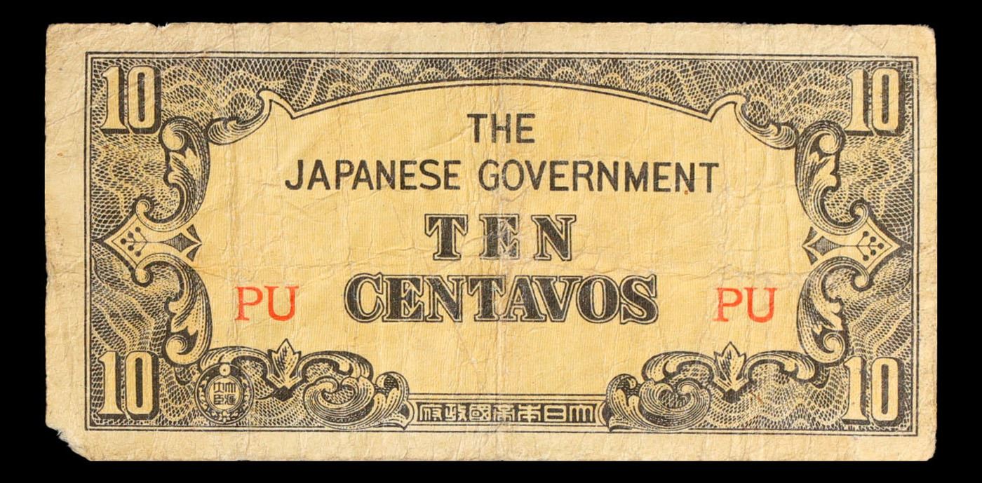 1942 Philippines Under Japanese Occupation 10 Centavos Note P# 104A Grades vf+. Japanese invasion money, officially known as Southern Development Bank Notes (Japanese: ??????? Dai T?-A Sens? gunpy?, "Greater East Asia War military scrip"), was currency issued by the Japanese Military Authority as a replacement for local currency after the conquest of colonies and other states in World War II. Japan printed this currency for many countries, including Malaysia, Singapore, North Borneo, Sarawak, Burma, Brunei, and several Oceania territories controlled by Australia.