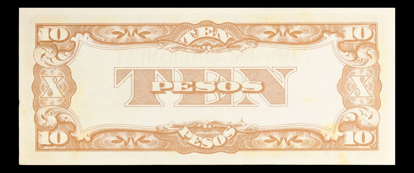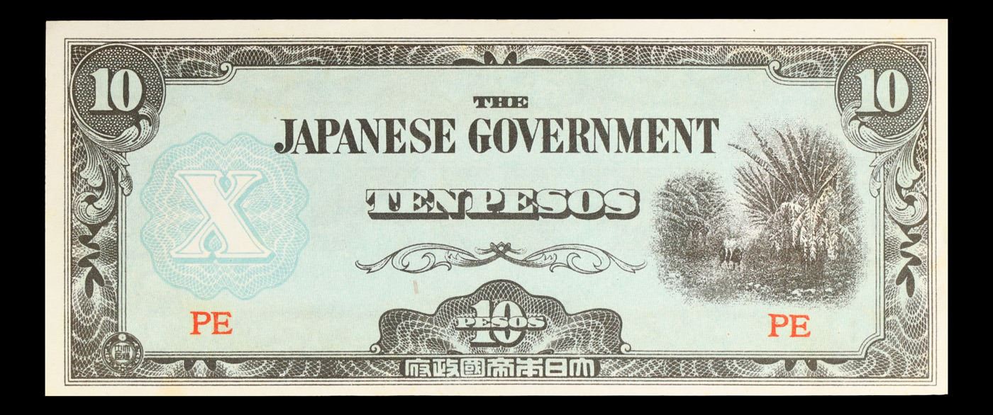 1942 Philippines Under Japanese Occupation 10 Peso Note P# 108A Grades Choice CU. Japanese invasion money, officially known as Southern Development Bank Notes (Japanese: _______ Dai T_-A Sens_ gunpy_, "Greater East Asia War military scrip"), was currency issued by the Japanese Military Authority as a replacement for local currency after the conquest of colonies and other states in World War II. Japan printed this currency for many countries, including Malaysia, Singapore, North Borneo, Sarawak, Burma, Brunei, and several Oceania territories controlled by Australia.