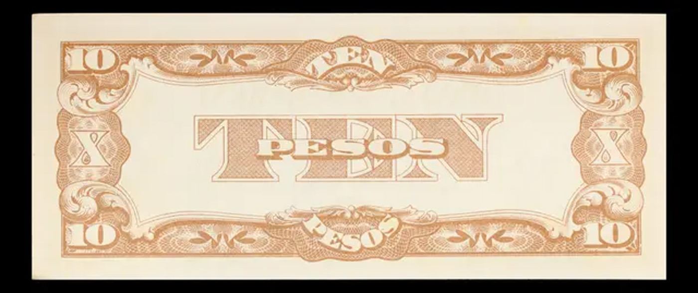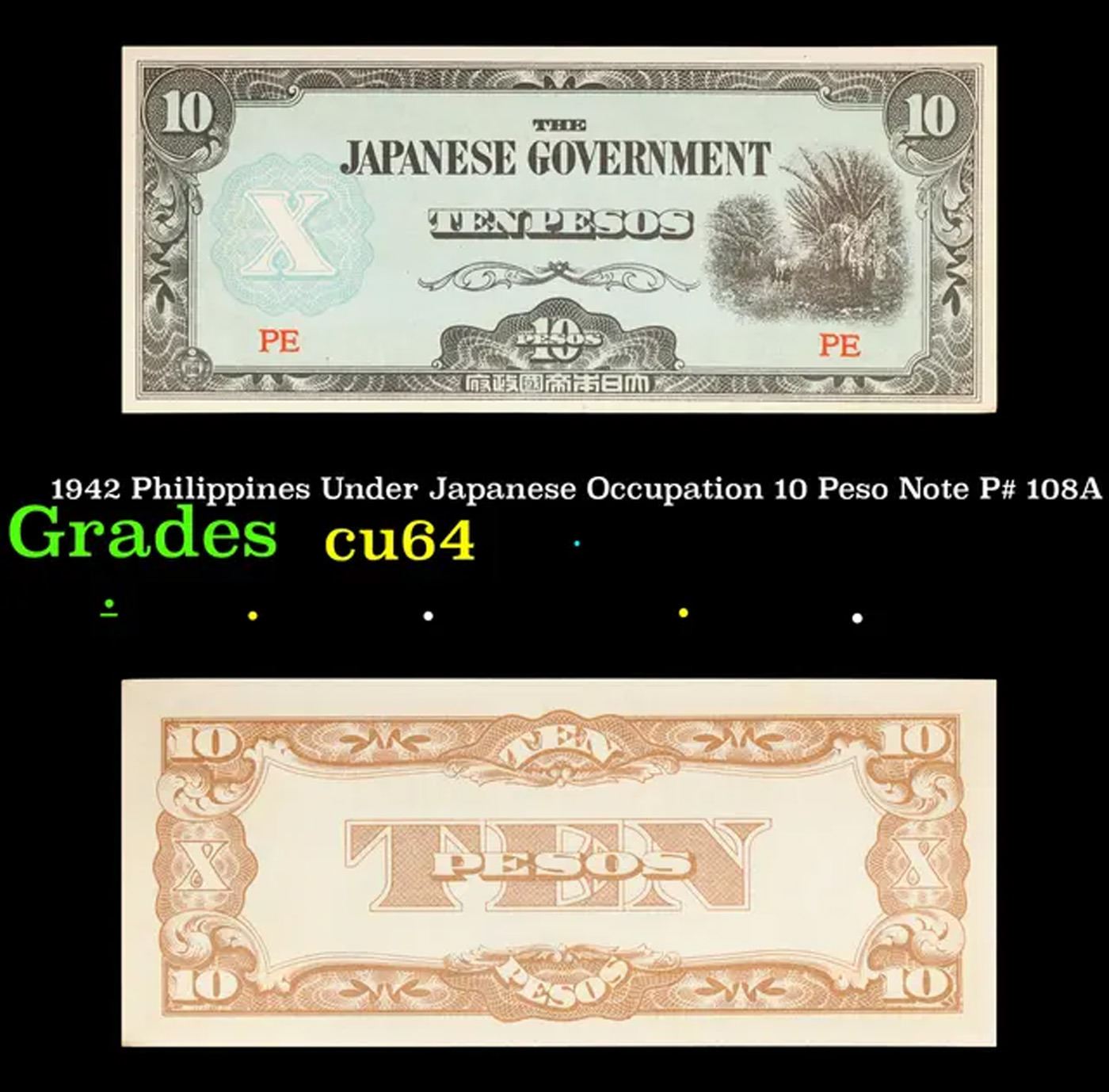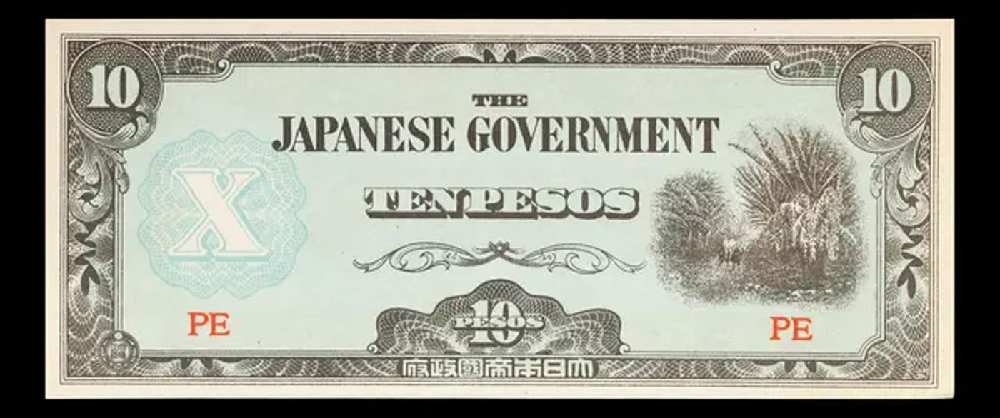 1942 Philippines Under Japanese Occupation 10 Peso Note P# 108A Grades Choice CU. Japanese invasion money, officially known as Southern Development Bank Notes (Japanese: ??????? Dai T?-A Sens? gunpy?, "Greater East Asia War military scrip"), was currency issued by the Japanese Military Authority as a replacement for local currency after the conquest of colonies and other states in World War II. Japan printed this currency for many countries, including Malaysia, Singapore, North Borneo, Sarawak, Burma, Brunei, and several Oceania territories controlled by Australia.