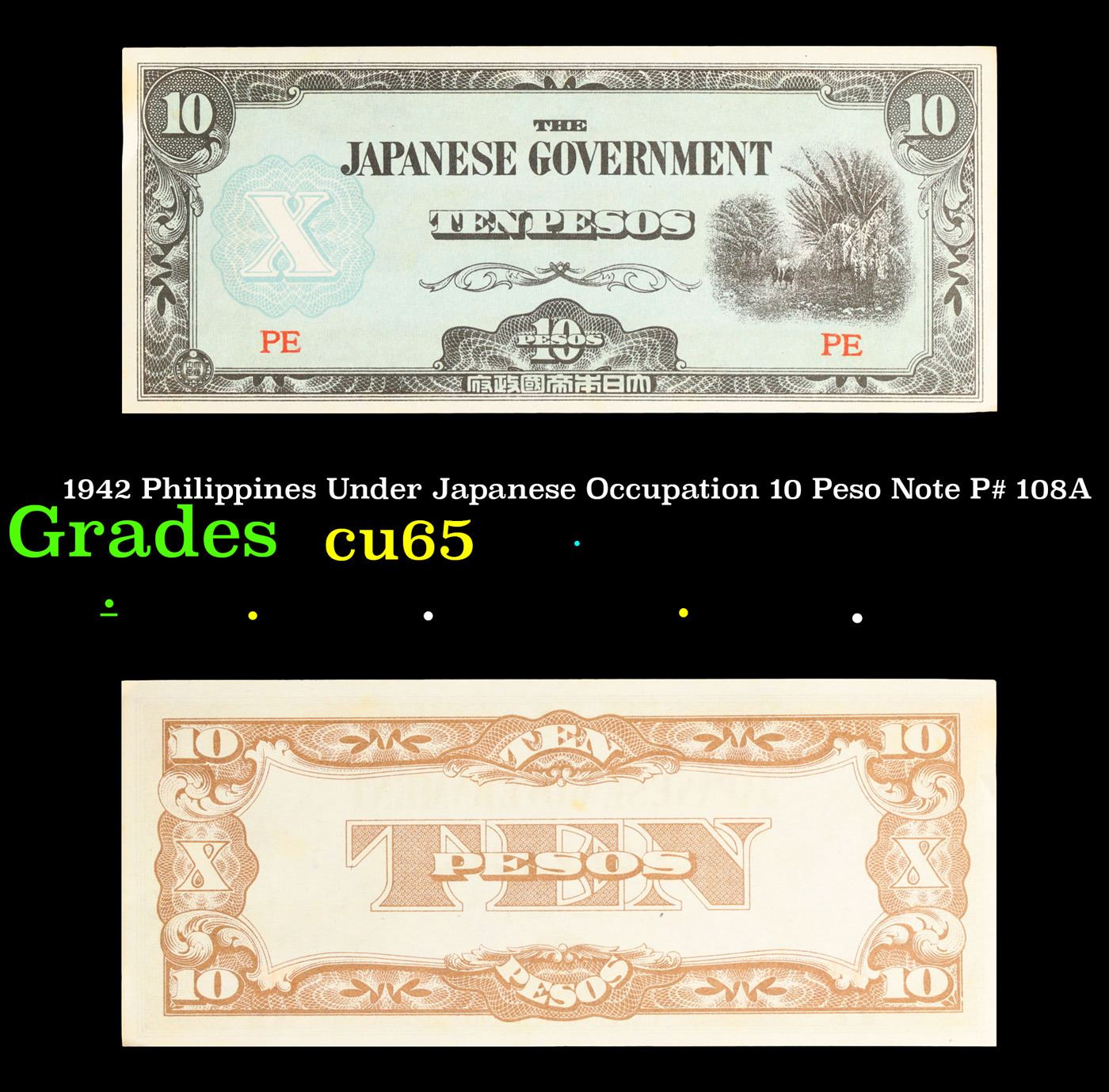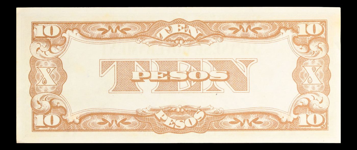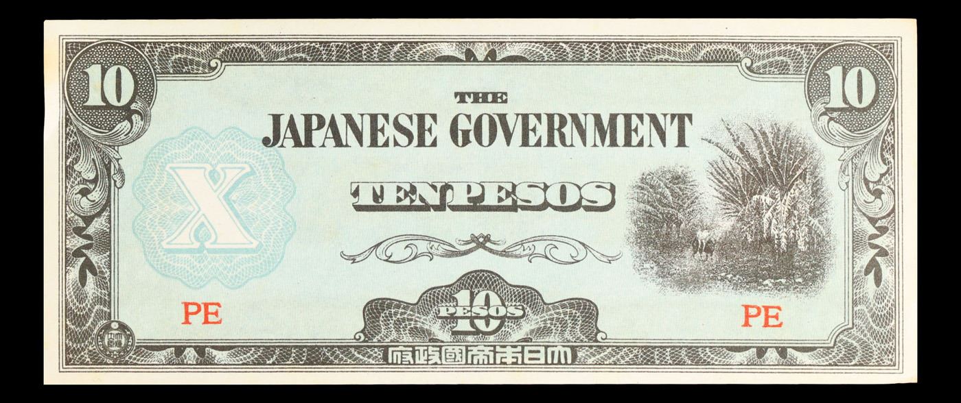 1942 Philippines Under Japanese Occupation 10 Peso Note P# 108A Grades Gem CU. Japanese invasion money, officially known as Southern Development Bank Notes (Japanese: ??????? Dai T?-A Sens? gunpy?, "Greater East Asia War military scrip"), was currency issued by the Japanese Military Authority as a replacement for local currency after the conquest of colonies and other states in World War II. Japan printed this currency for many countries, including Malaysia, Singapore, North Borneo, Sarawak, Burma, Brunei, and several Oceania territories controlled by Australia.