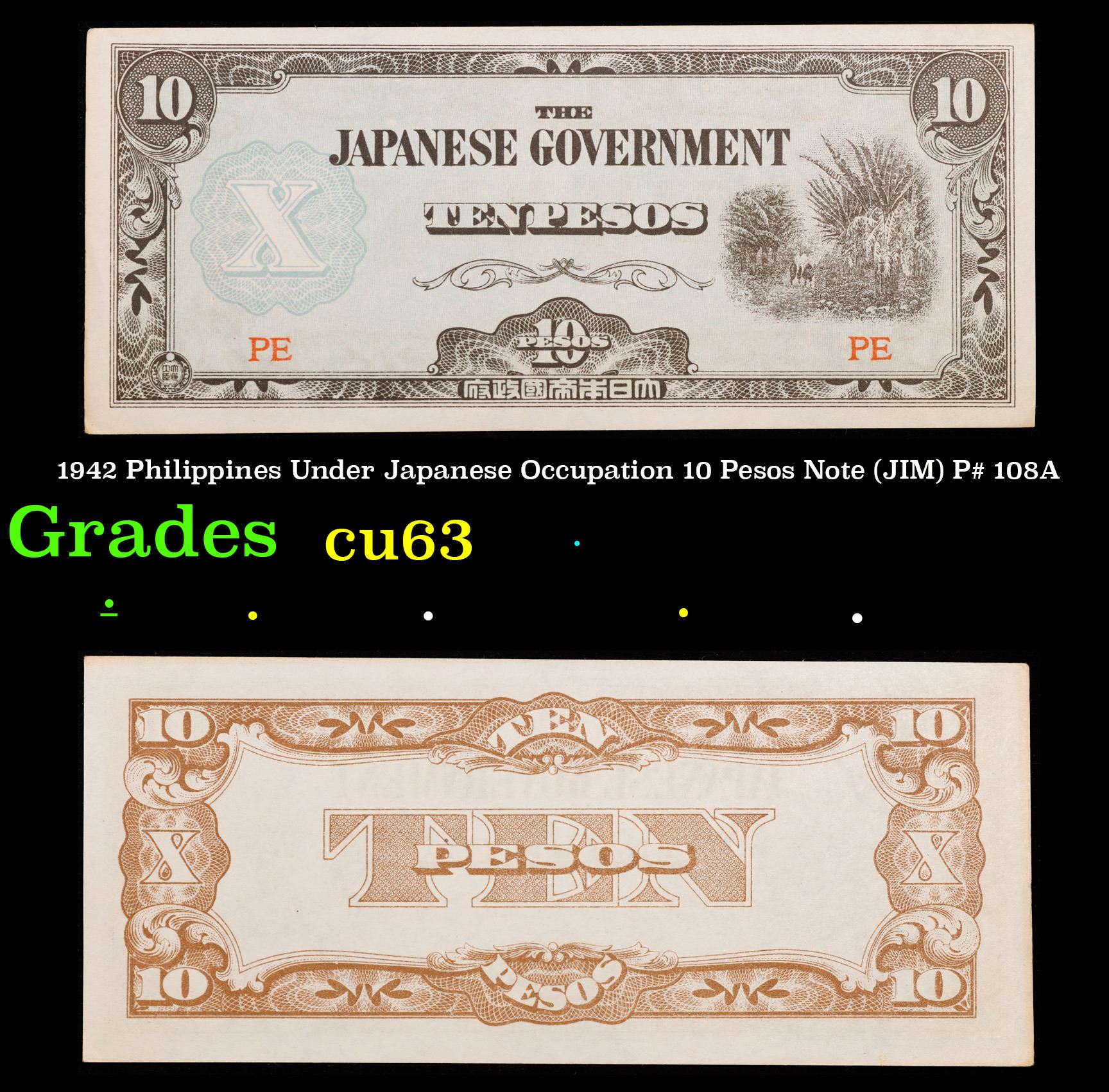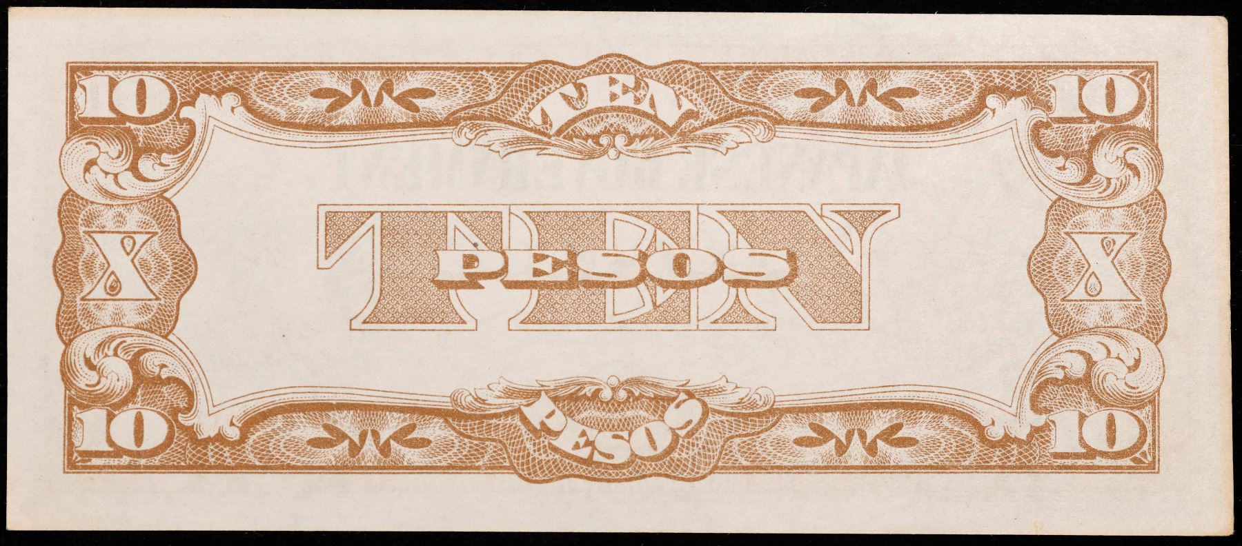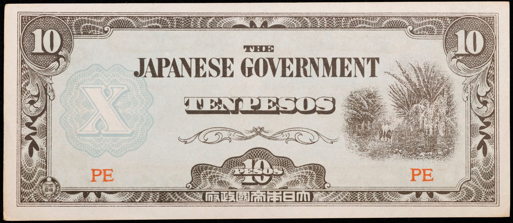 1942 Philippines Under Japanese Occupation 10 Pesos Note (JIM) P# 108A Grades Select CU. Japanese invasion money, officially known as Southern Development Bank Notes (Japanese: ??????? Dai T?-A Sens? gunpy?, "Greater East Asia War military scrip"), was currency issued by the Japanese Military Authority as a replacement for local currency after the conquest of colonies and other states in World War II. Japan printed this currency for many countries, including Malaysia, Singapore, North Borneo, Sarawak, Burma, Brunei, and several Oceania territories controlled by Australia.